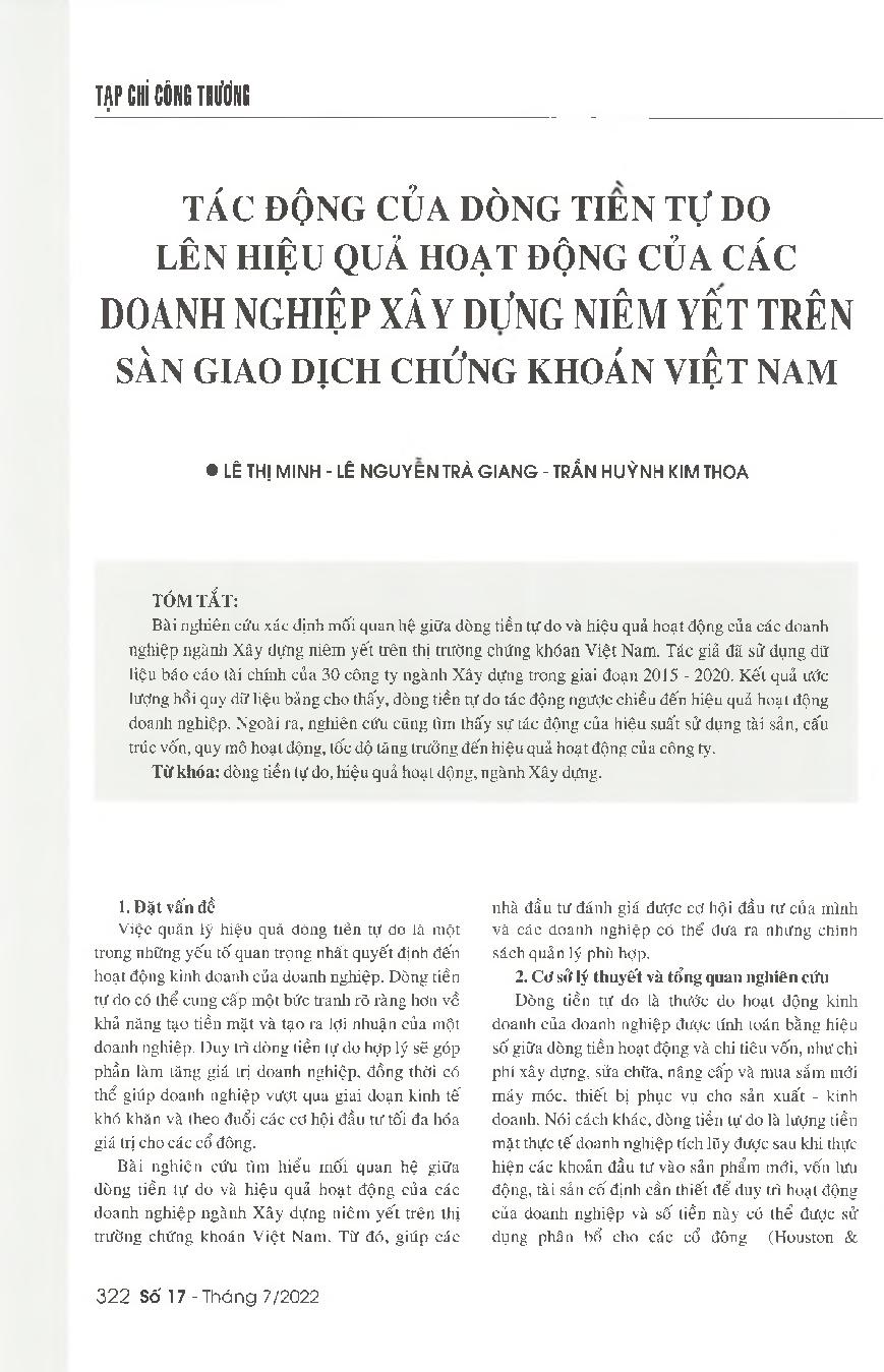 Tác động của dòng tiền tự do lên hiệu quả hoạt động của các doanh nghiệp xây dựng niêm yết trên sàn giao dịch chứng khoán Việt Nam = Impacts of the free cash flow on the performance of construction companies listed on the Vietnam&; 39;s stock market