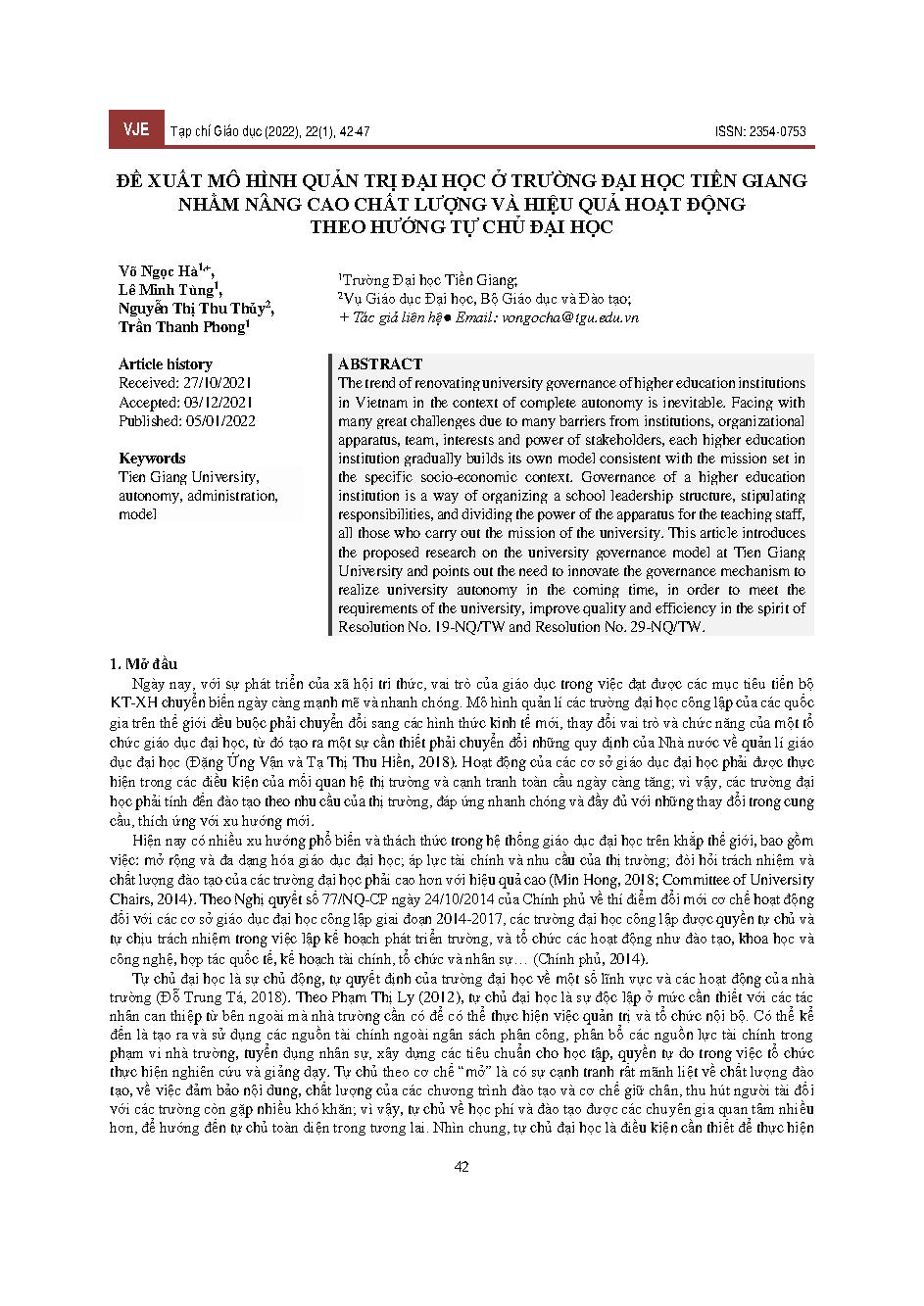 Đề xuất mô hình quản trị đại học ở Trường Đại học Tiền Giang nhằm nâng cao chất lượng và hiệu quả hoạt động theo hướng tự chủ đại học = Proposing a university governance model at Tien Giang University to improve the quality and efficiency of operations to