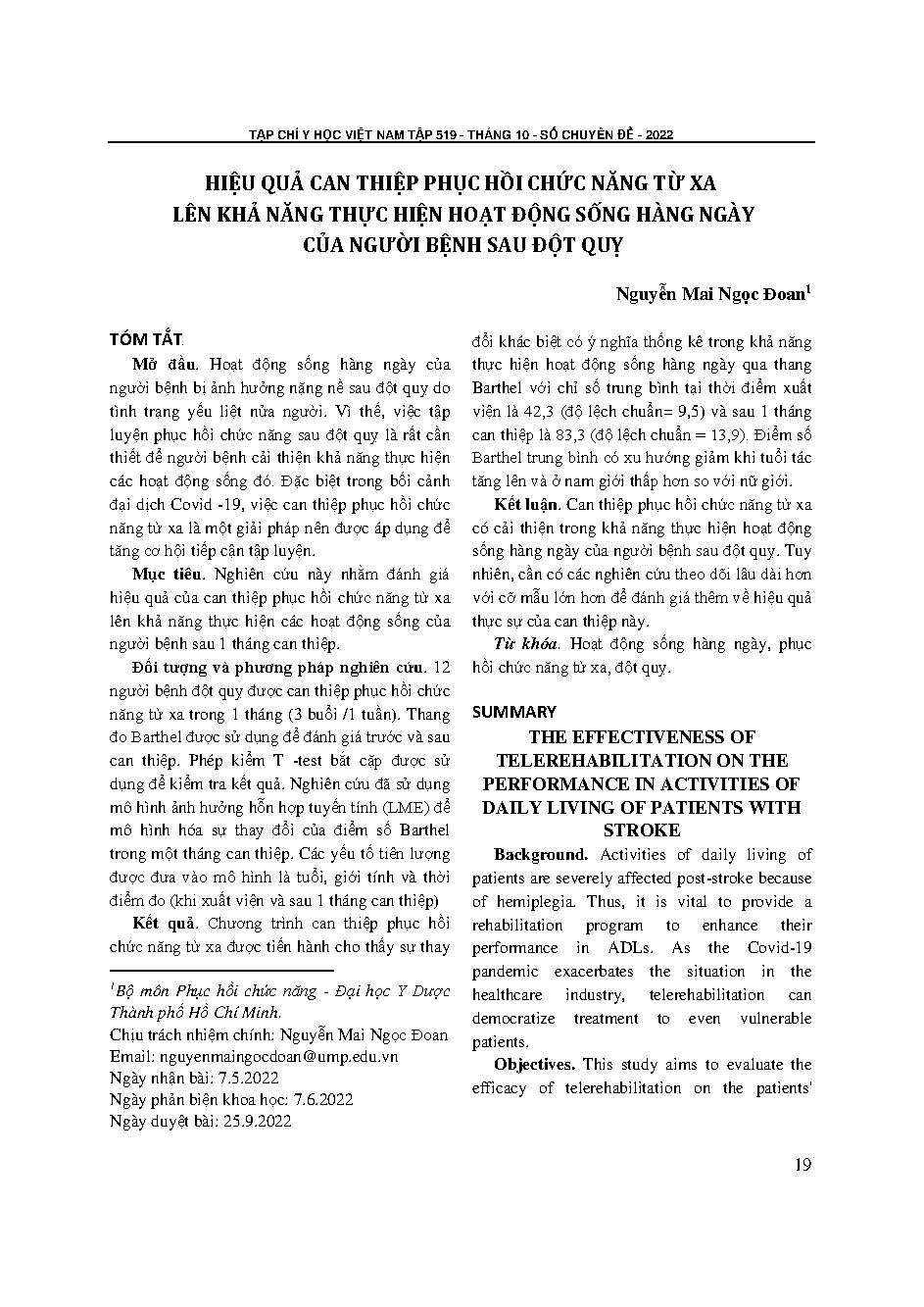 Hiệu quả can thiệp phục hồi chức năng từ xa lên khả năng thực hiện hoạt động sống hàng ngày của người bệnh sau đột quỵ = The effectiveness of telerehabilitation on the performance in activities of daily living of patients with stroke