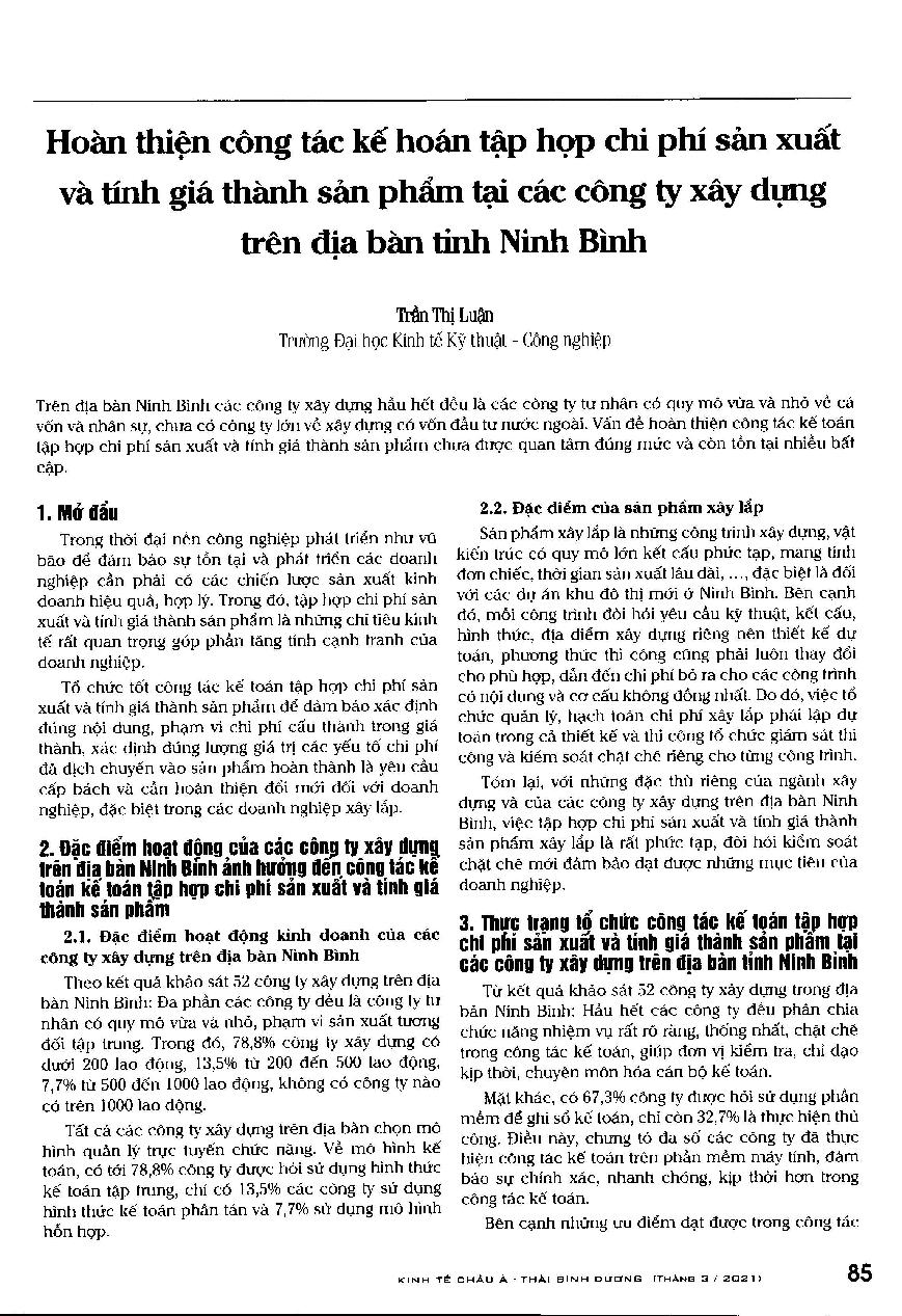 Hoàn thiện công tác kế toán tập hợp chi phí sản xuất và tính giá thành sản phẩm tại các công ty xây dựng trên địa bàn tỉnh Ninh Bình