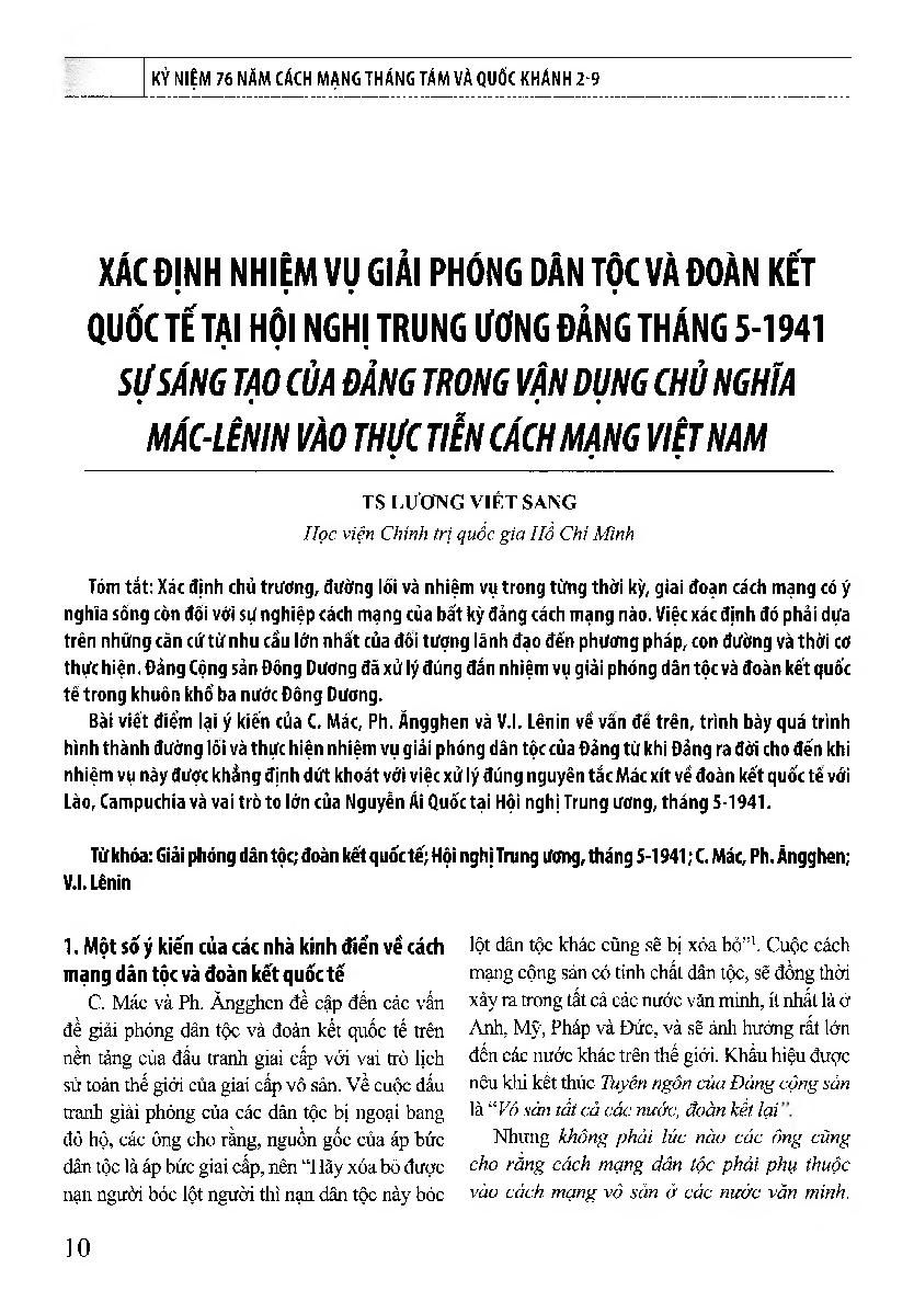 Xác định nhiệm vụ giải phóng dân tộc và đoàn kết quốc tế tại Hội nghị Trung ương Đảng tháng 5-1941 sự sáng tạo của Đảng trong vận dụng chủ nghĩa Mác-Lênin thực vào tiễn cách mạng Việt Nam