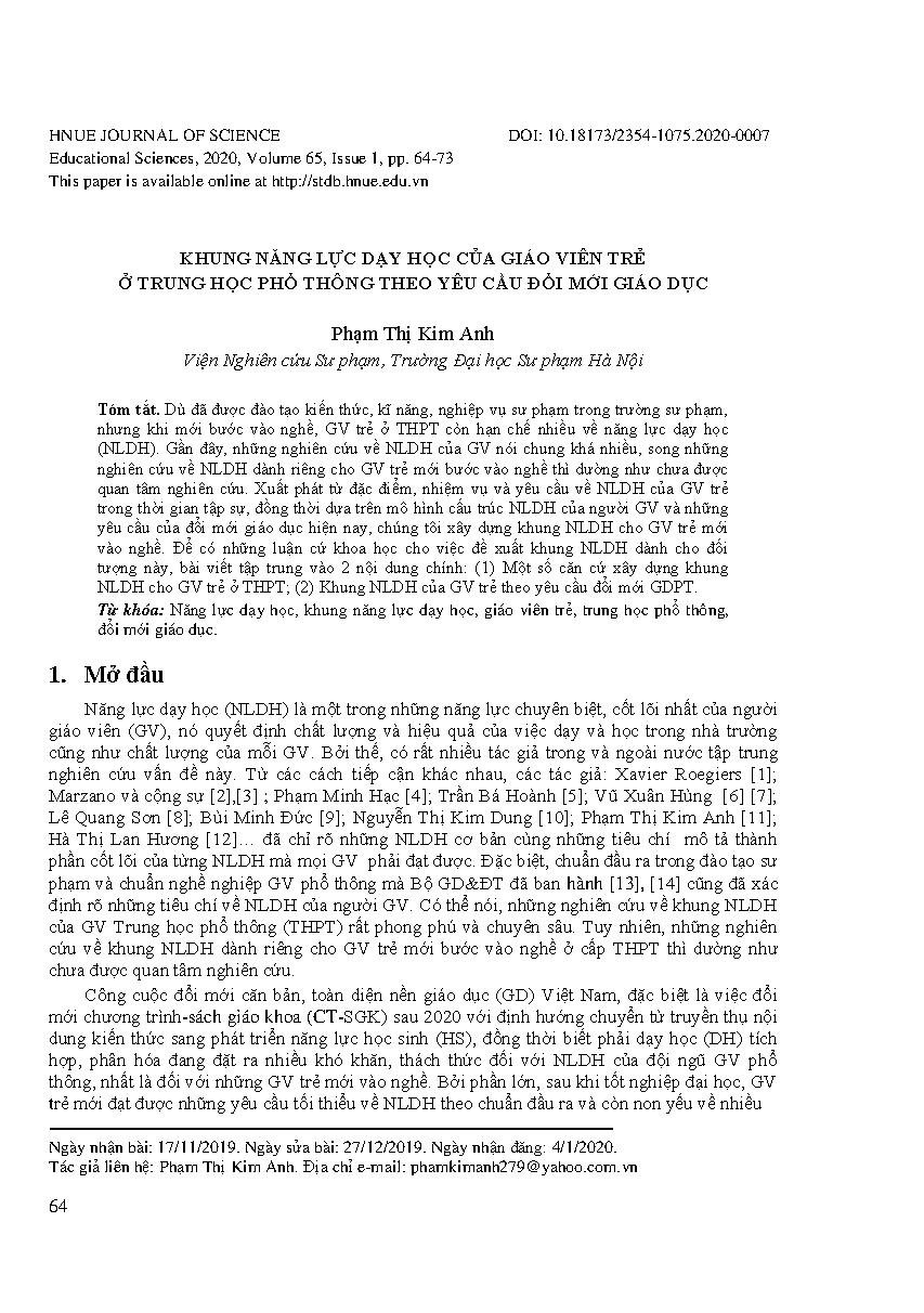 Khung năng lực dạy học của giáo viên trẻ ở trung học phổ thông theo yêu cầu đổi mới giáo dục = Teaching competence framework for young teacher in highschools as rewquiret by educationl renewal