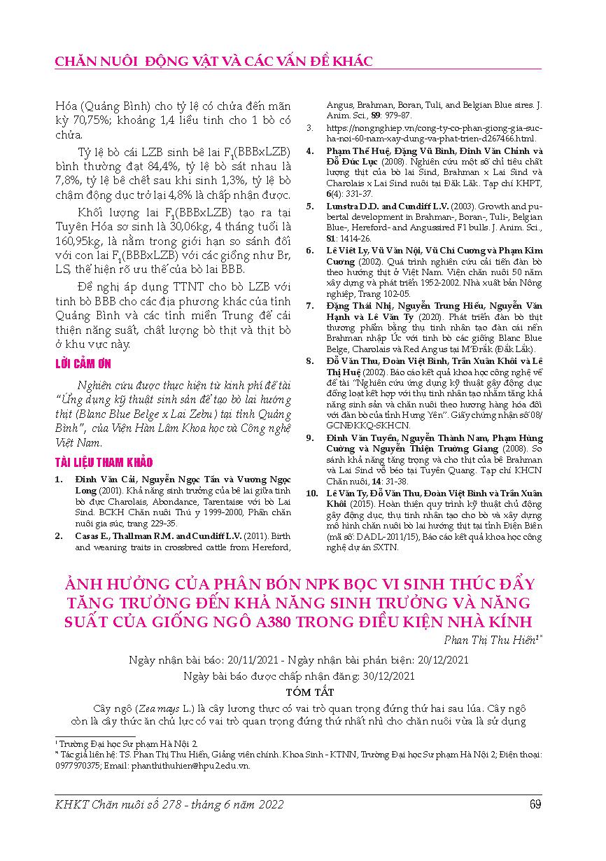 Ảnh hưởng của phân bón NPK bọc vi sinh thúc đẩy tăng trưởng đến khả năng sinh trưởng và năng suất của giống ngô A380 trong điều kiện nhà kính = Effects of growth-promoted north NPK fertilizer on growth and yield of maize variety A380 under greenhouse cond