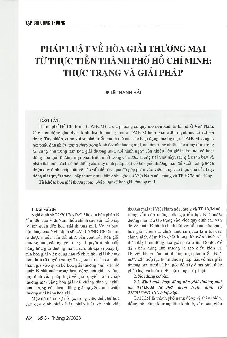 Pháp luật về hòa giải thương mại từ thực tiễn Thành phố Hồ Chí Minh: Thực trạng và giải pháp = Provisions on commercial mediation from the practice in Ho Chi Minh City: Current situation and solutions