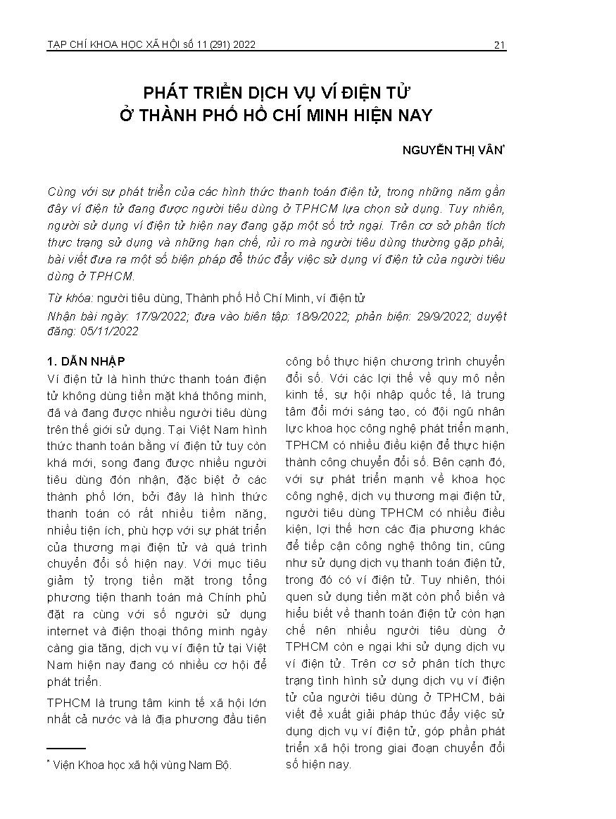 Phát triển dịch vụ ví điện tử ở thành phố Hồ Chí Minh hiện nay = Developing the current e-Wallet service in Ho Chi Minh city