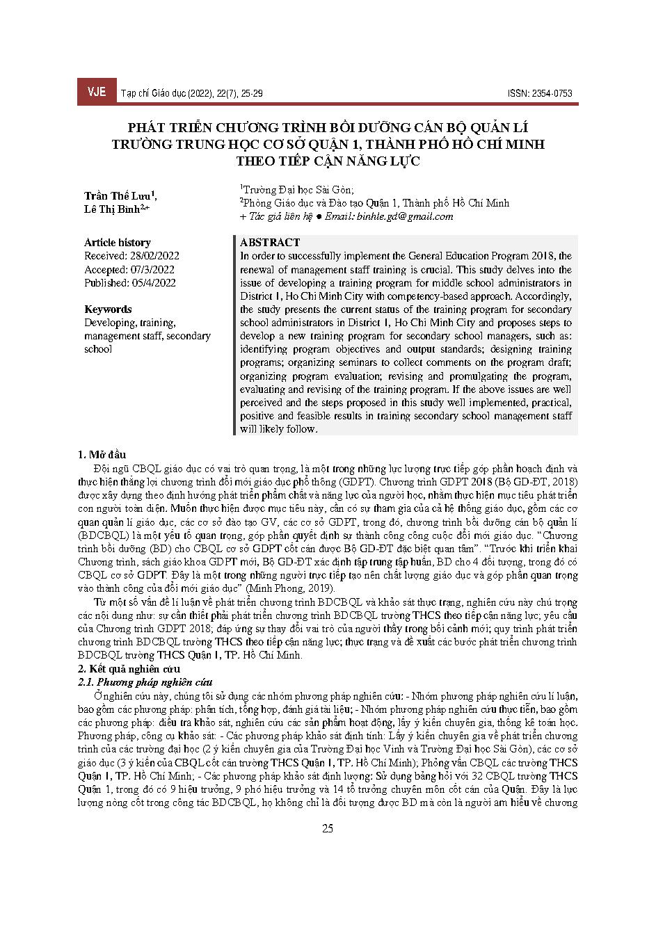 Phát triển chương trình bồi dưỡng cán bộ quản lí trường trung học cơ sở quận 1, thành phố Hồ Chí Minh theo tiếp cận năng lực = Developing a training program for junior high school administrators in District 1, Ho Chi Minh City according to competency appr
