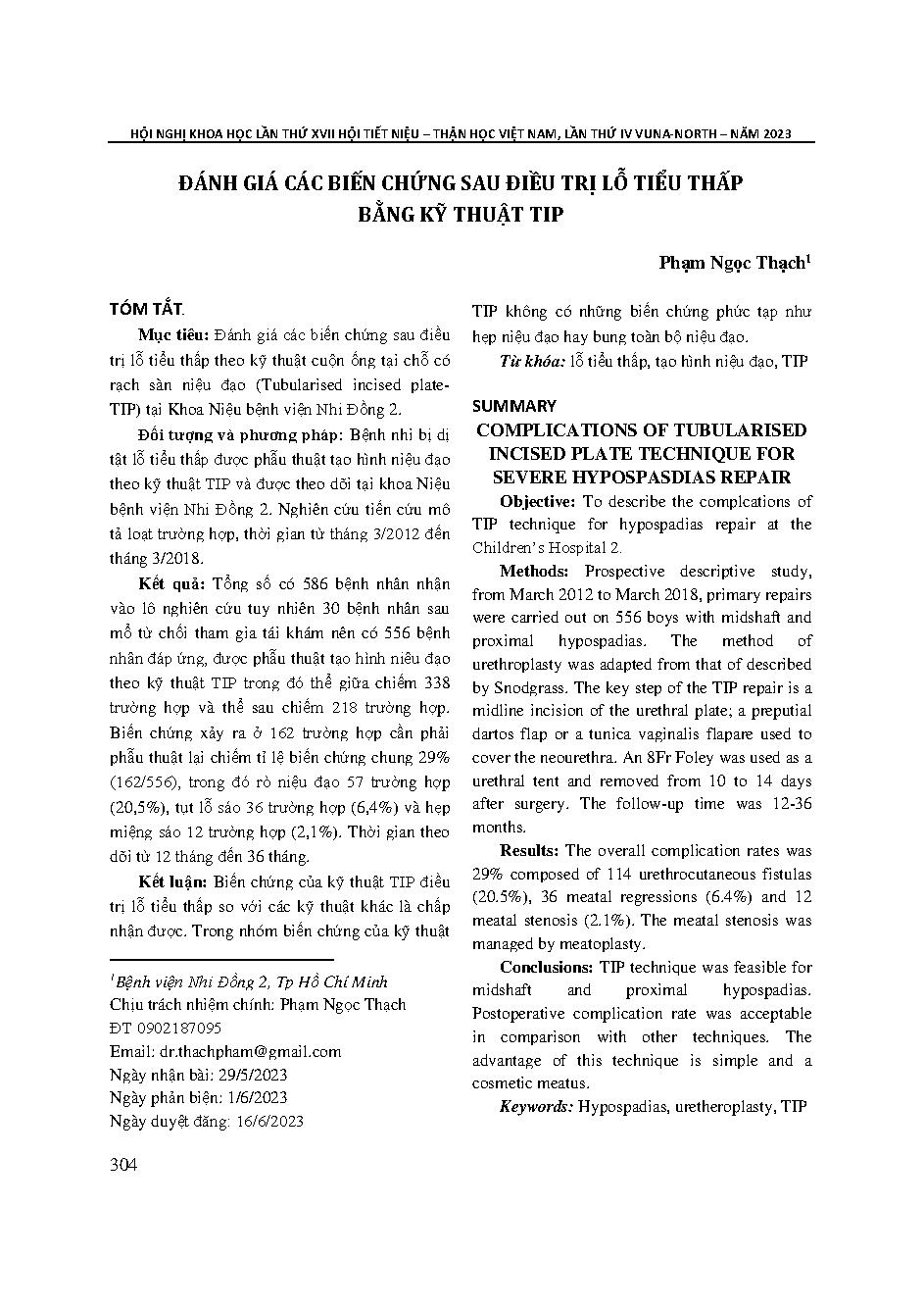 Đánh giá các biến chứng sau điều trị lỗ tiểu thấp bằng kỹ thuật TIP