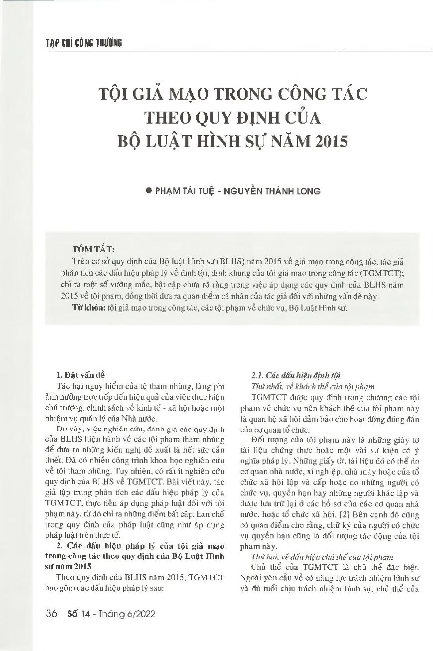 Tội giả mạo trong công tác theo quy định của Bộ luật Hình sự năm 2015 = Commission of fraud in performance of duties under 2015 Criminal Code