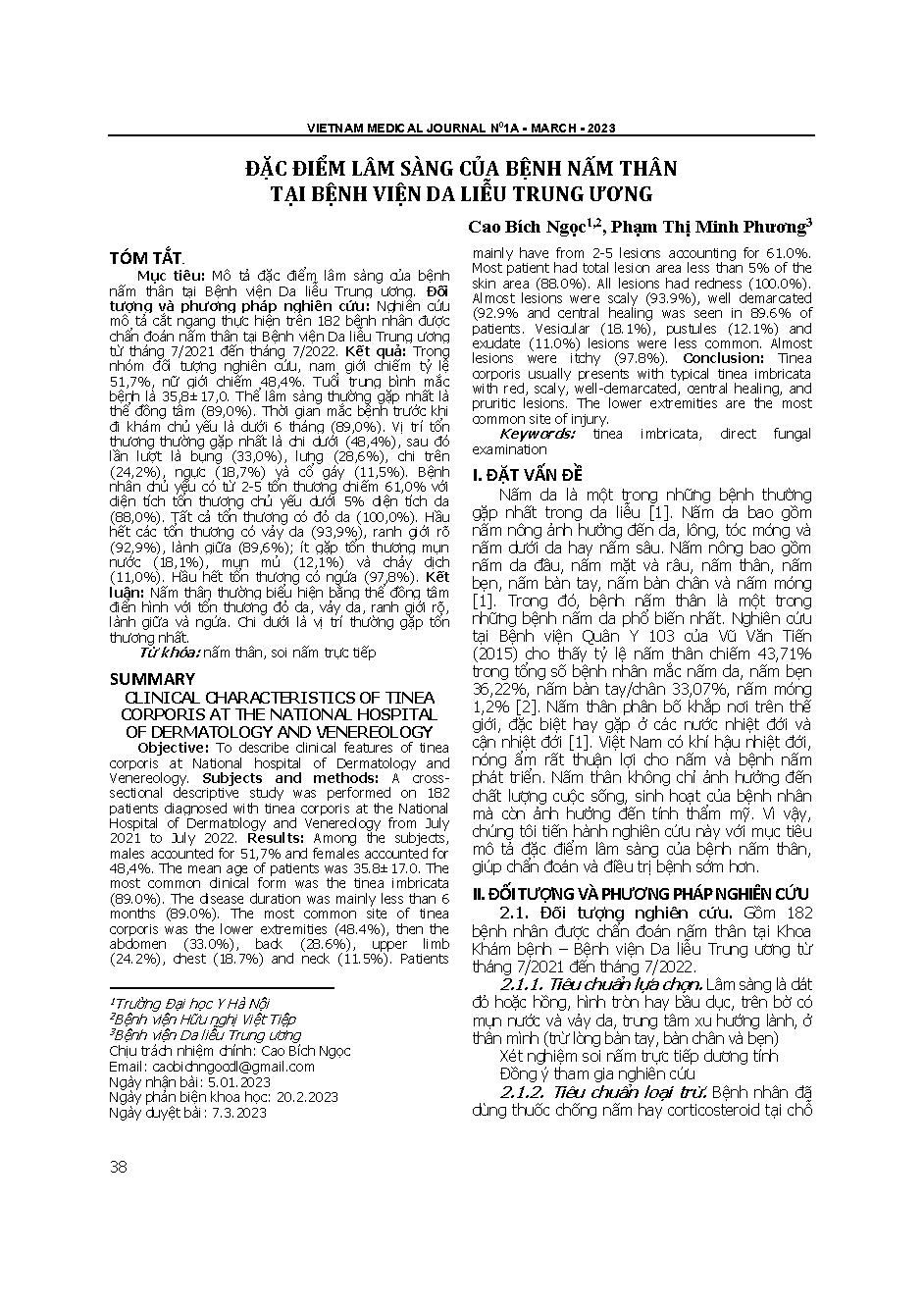 Đặc điểm lâm sàng của bệnh nấm thân tại Bệnh viện Da liễu Trung ương = Clinical characteristics of tinea corporis at the national hospital of dermatology and venereology