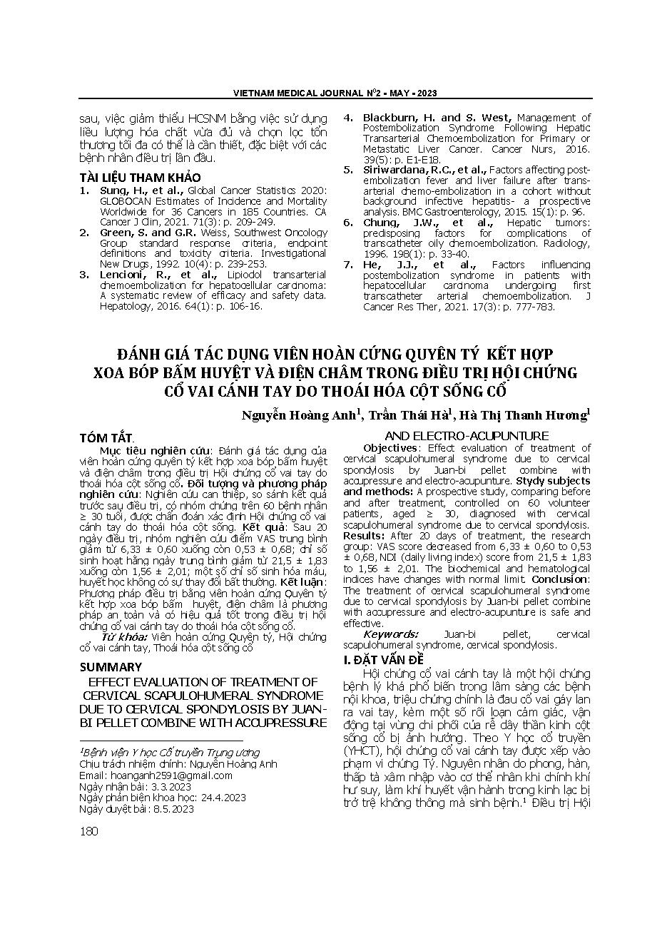 Đánh giá tác dụng viên hoàn cứng quyên tý kết hợp xoa bóp bấm huyệt và điện châm trong điều trị hội chứng cổ vai cánh tay do thoái hóa cột sống cổ = Effect evaluation of treatment of cervical scapulohumeral syndrome due to cervical spondylosis by juan-bi