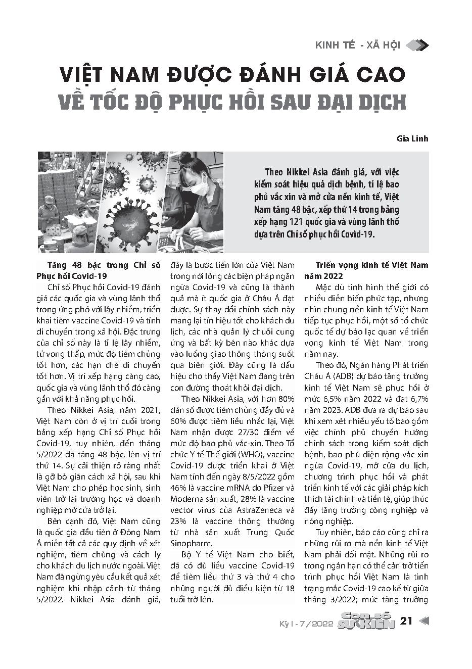 Việt Nam được đánh giá cao về tốc độ phục hồi sau đại dịch = Vietnam is highly appreciated for the speed of recovery after the pandemic