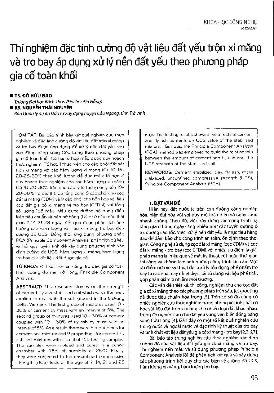 Thí nghiệm đặc tính cường độ vật liệu đất yếu trộn xi măng và tro bay áp dụng xử lý nền đất yếu theo phương pháp gia cố toàn khối