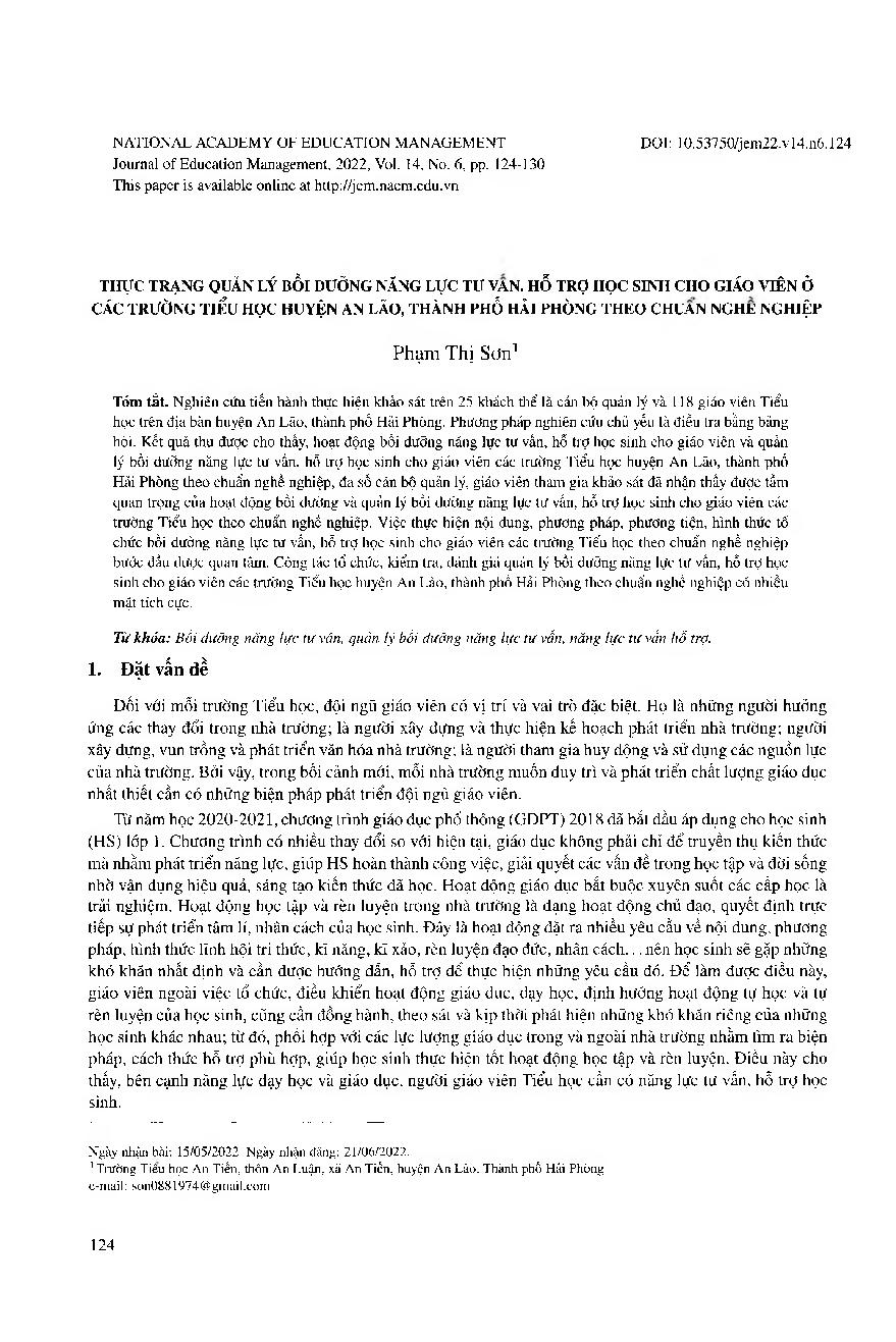Thực trạng quản lý bồi dưỡng năng lực tư vấn, hỗ trợ học sinh cho giáo viên ở các trường tiểu học huyện An Lão, thành phố Hải Phòng theo chuẩn nghề nghiệp = The current situation of management of fostering the capacity of counseling and support students f