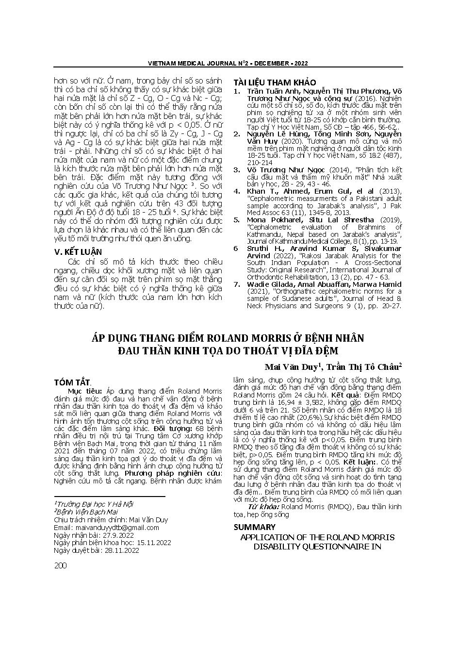 Áp dụng thang điểm Roland Morris ở bệnh nhân đau thần kinh tọa do thoát vị đĩa đệm = Application of the roland morris disability questionnaire in patients with sciatica due to disc herniation