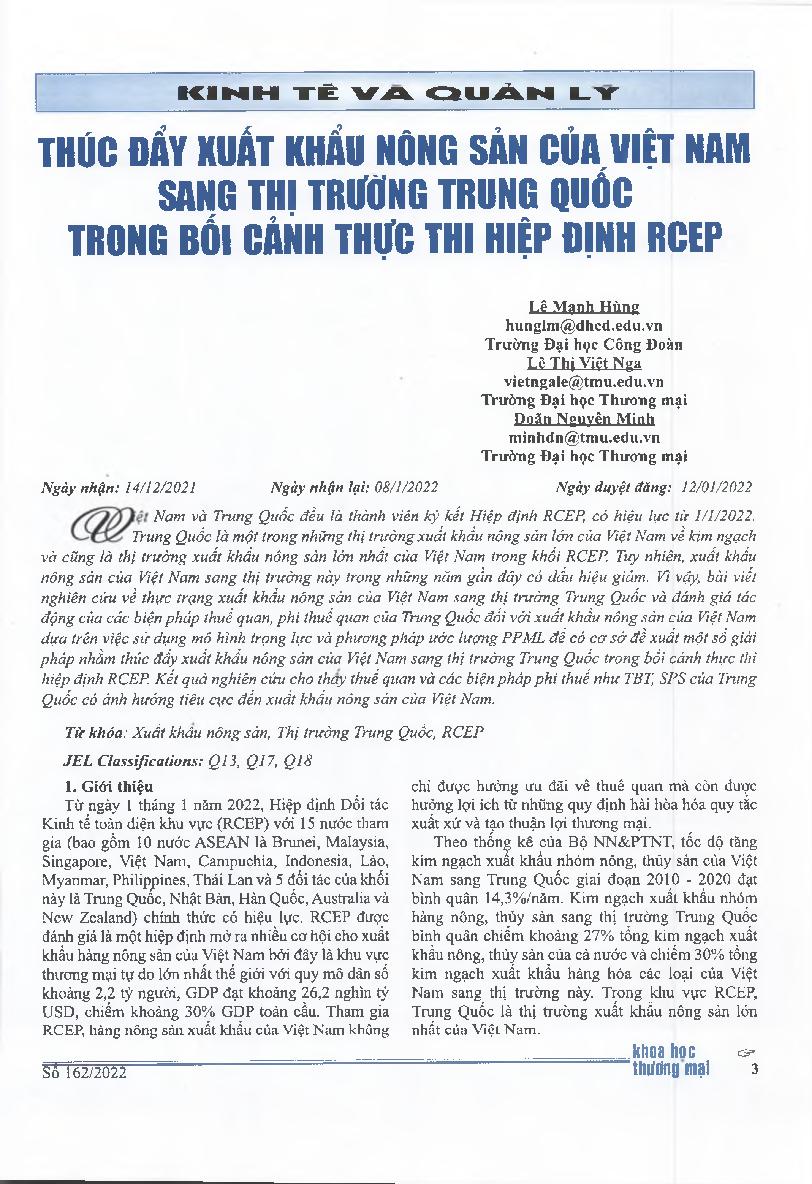 Thúc đẩy xuất khẩu nông sản của Việt Nam sang thị trường Trung Quốc trong bối cảnh thực thi hiệp định RCEP = Developing Vietnam&; 39;s Agriculture Exports to China Market in The Entry Into Force of The RCEP Agreement