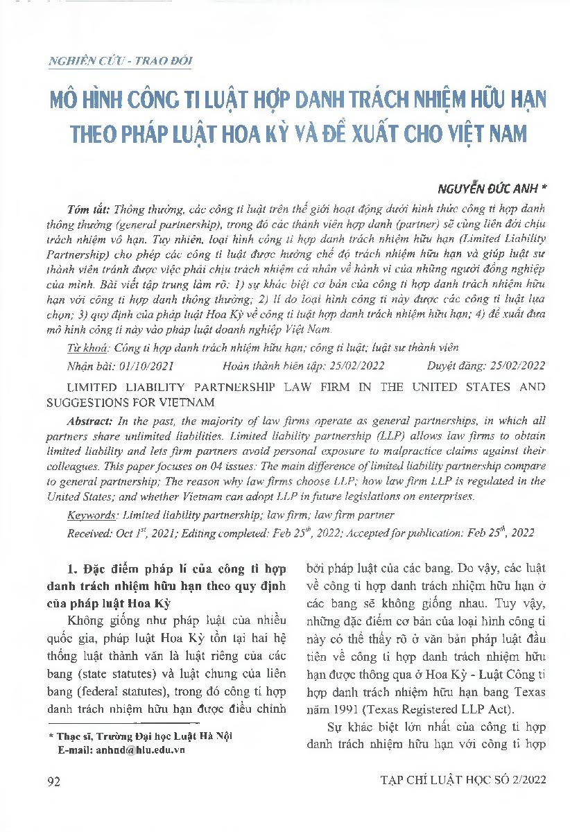 Mô hình công ti luật hợp danh trách nhiệm hữu hạn theo pháp luật Hoa Kỳ và đề xuất cho Việt Nam = Limited liability partnership law firm in the United States and suggestions for Vietnam