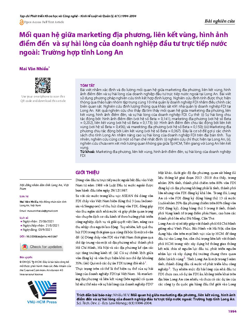 Mối quan hệ giữa marketing địa phương, liên kết vùng, hình ảnh điểm đến và sự hài lòng của doanh nghiệp đầu tư trực tiếp nước ngoài: Trường hợp tỉnh Long An = The relationship among local marketing, regional linkage, a destination image, and foreign direc