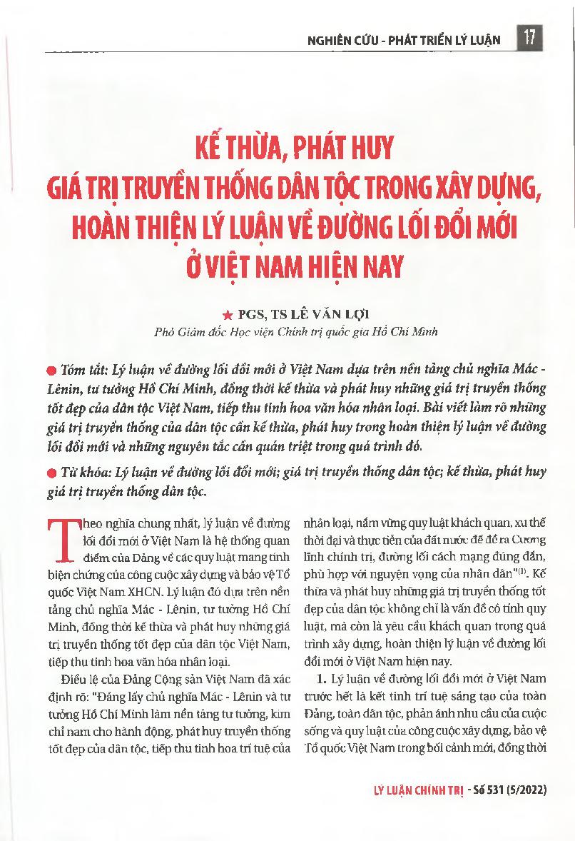 Kế thừa, phát huy giá trị truyền thống dân tộc trong xây dựng, hoàn thiện lý luận về đường lối đổi mới ở Việt Nam hiện nay = Inheritance and promotion of the traditional national values in building and completing the ideology of Vietnam&; 39;s renovation g