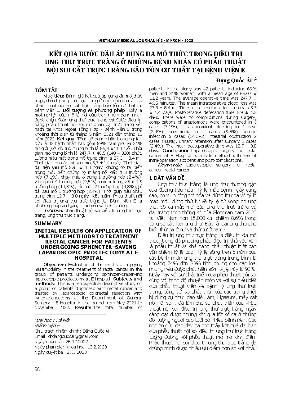 Kết quả bước đầu áp dụng đa mô thức trong điều trị ung thư trực tràng ở những bệnh nhân có phẫu thuật nội soi cắt trực tràng bảo tồn cơ thắt tại bệnh viện E = Initial results on application of multiple methods to treatment rectal cancer for patients under