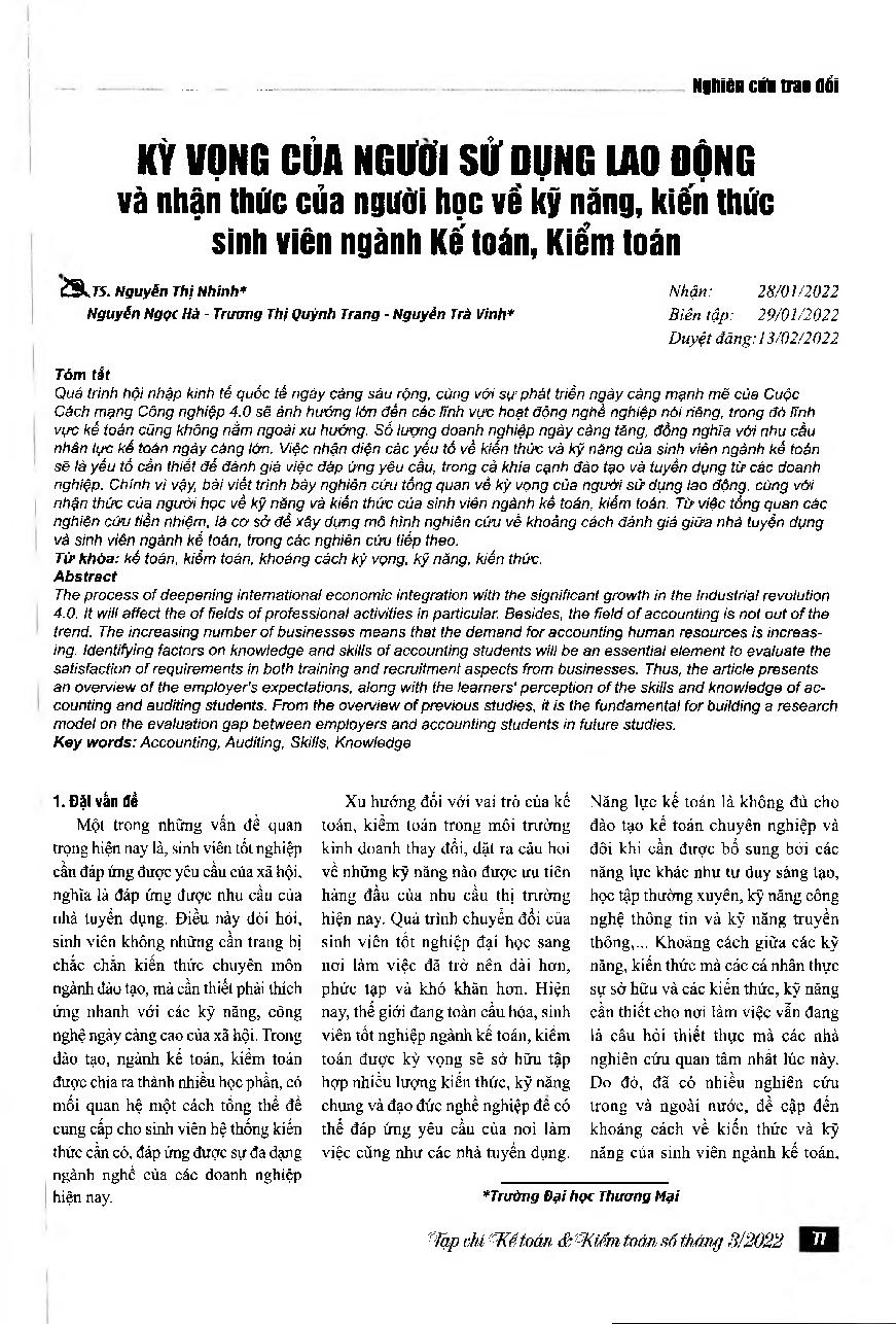 Kỳ vọng của người sử dụng lao động và nhận thức của người học về kỹ năng, kiến thức sinh viên ngành Kế toán, Kiểm toán = Overview of the research on employer&; 39;s expectations and students&; 39; cognition of skills, graduate accounting students&; 39; knowl