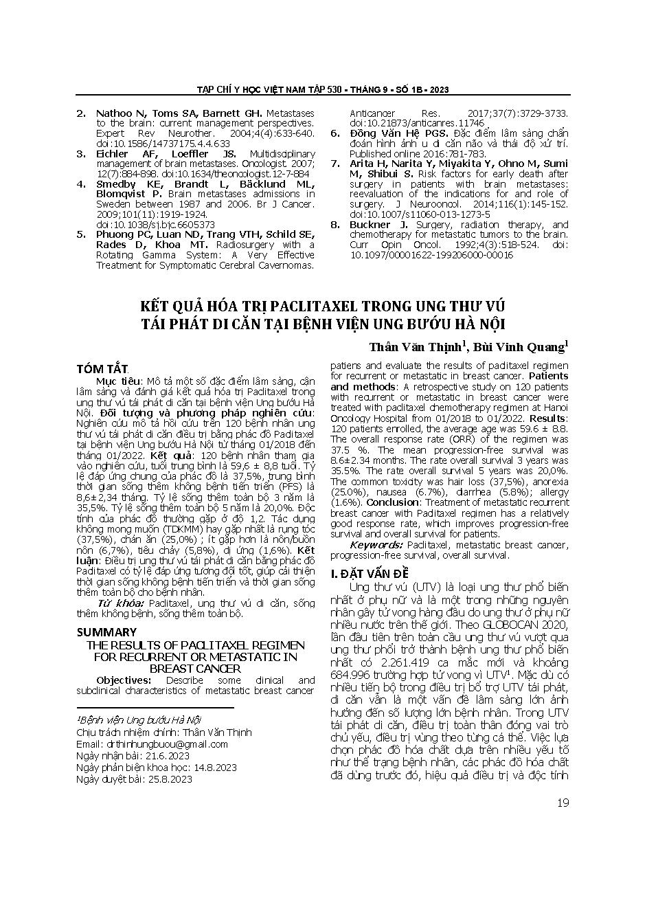 Kết quả hóa trị Paclitaxel trong ung thư vú tái phát di căn tại Bệnh viện Ung Bướu Hà Nội = The results of Paclitaxel regimen for recurrent or metastaticin breast cancer