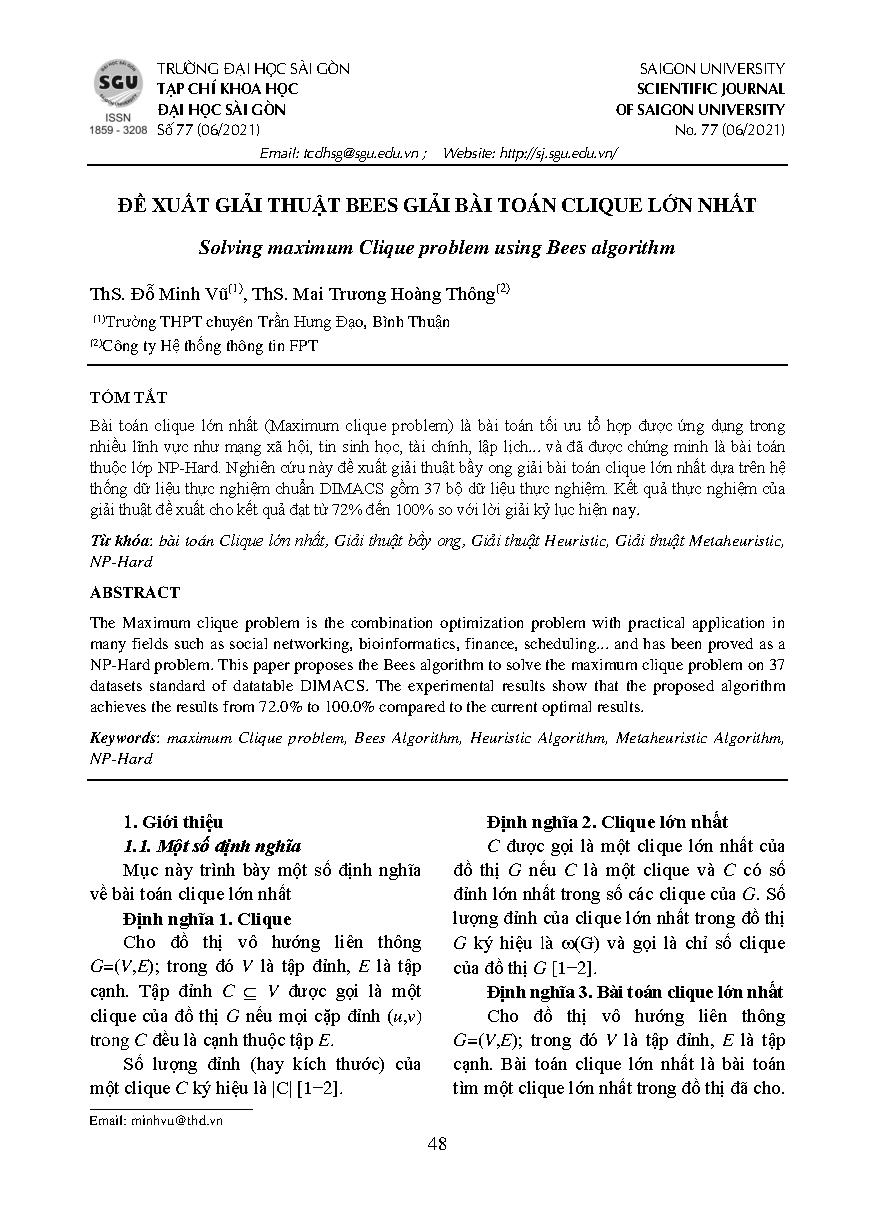 Đề xuất giải thuật Bees giải bài toán Clique lớn nhất = Solving maximum Clique problem using Bees algorithm