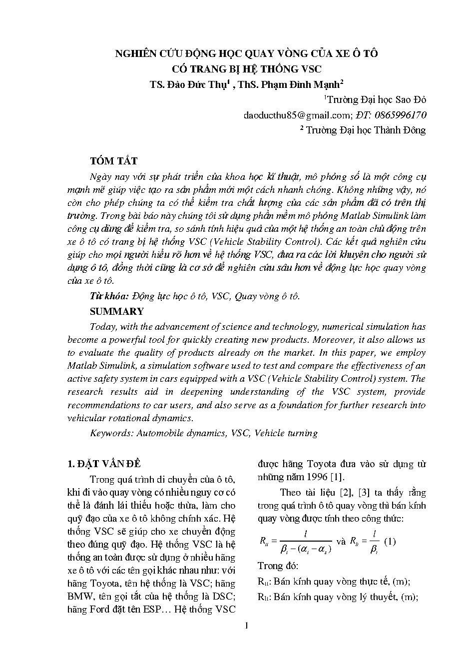 Nghiên cứu động học quay vòng của xe ô tô có trang bị hệ thống VSC = Research on turning dynamics of cars equipped with VSC system