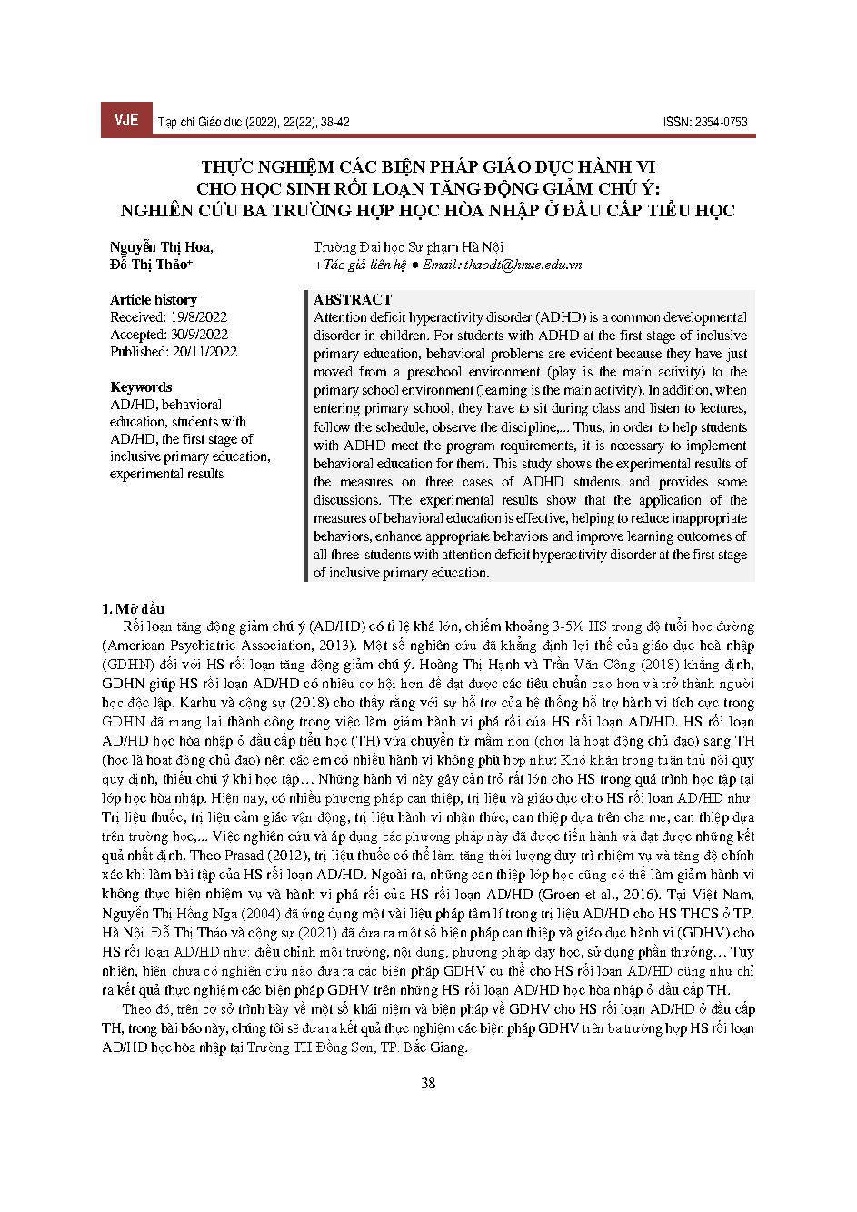 Thực nghiệm các biện pháp giáo dục hành vi cho học sinh rối loạn tăng động giảm chú ý: nghiên cứu ba trường hợp học hòa nhập ở đầu cấp tiểu học = Experimental behavioral education measures for students with attention deficit hyperactivity disorder: a stud