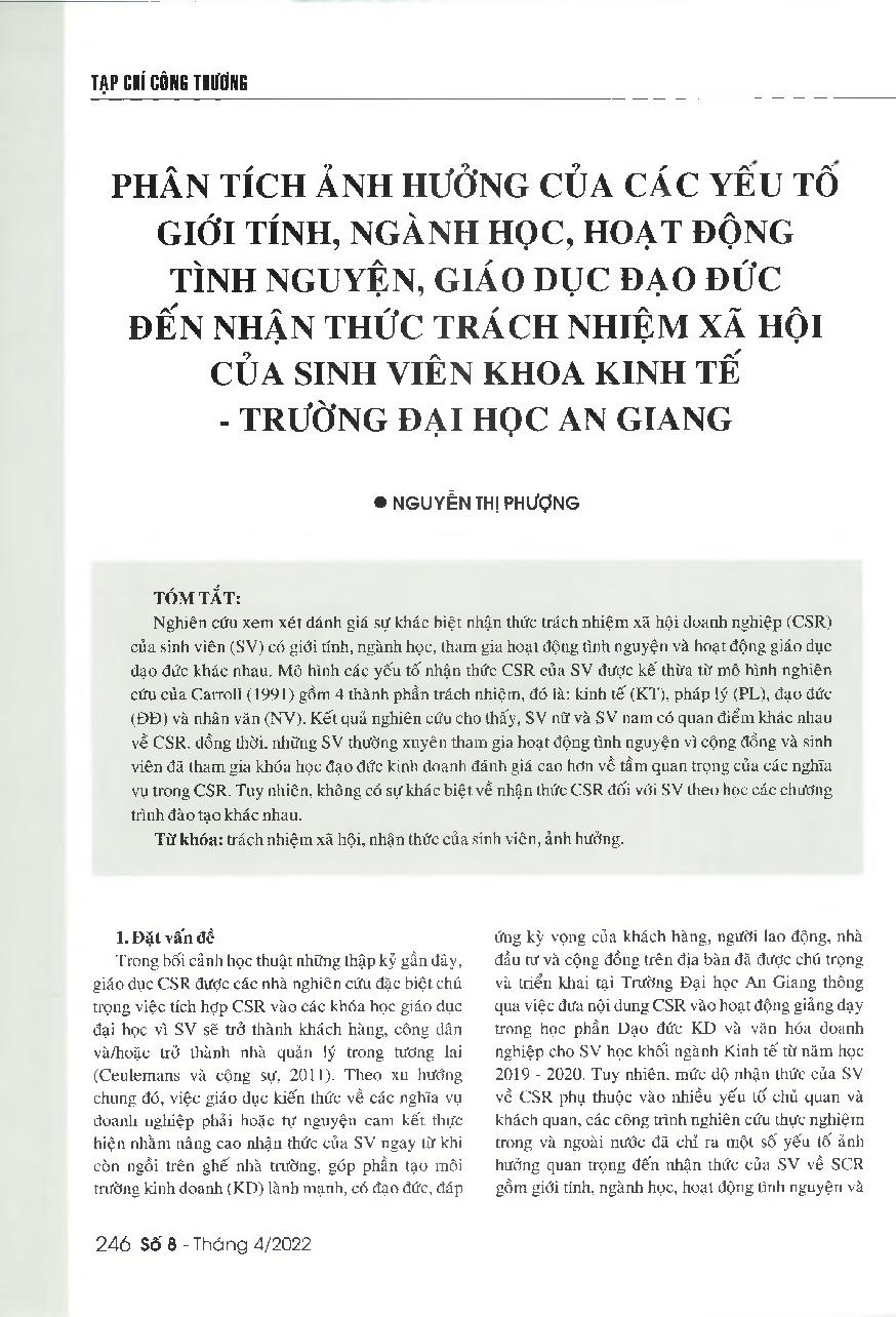 Phân tích ảnh hưởng của các yếu tố giới tính, ngành học, hoạt động tình nguyện, giáo dục đạo đức đến nhận thức trách nhiệm xã hội của sinh viên Khoa Kinh tế Trường Đại học An Giang = Analyzing the impacts of the gender, major, volunteerism, and business e