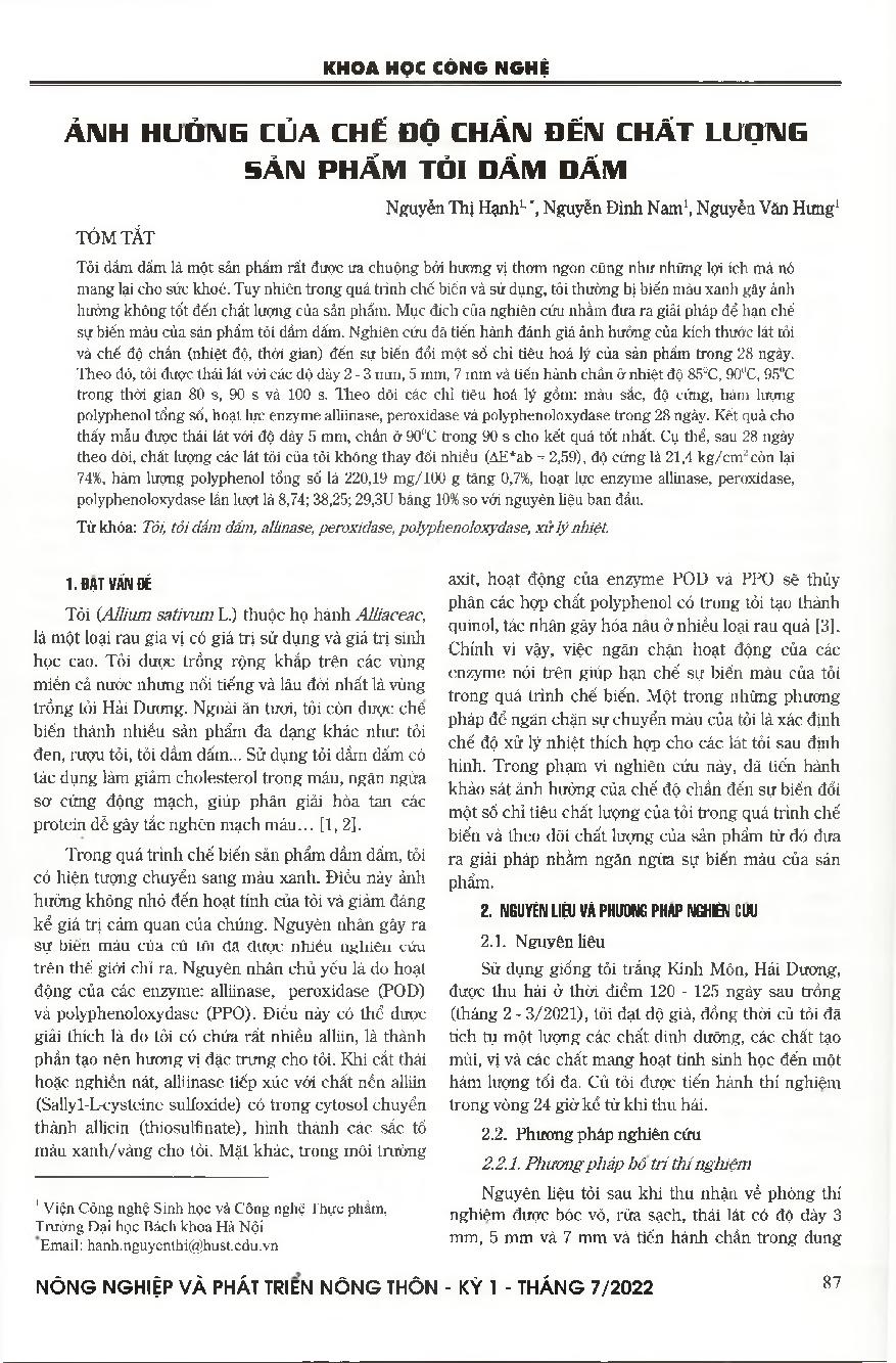 Ảnh hưởng của chế độ chần đến chất lượng sản phẩm tỏi dầm dấm = Effect of blanching regime on vinegar pickled garlic quality