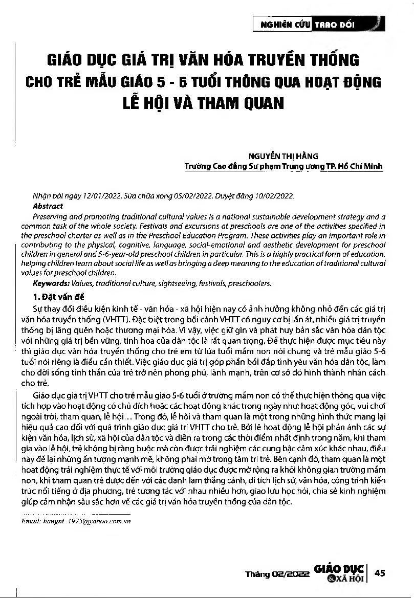 Giáo dục giá trị văn hóa truyền thống cho trẻ mẫu giáo 5-6 tuổi thông qua hoạt động lễ hội và tham quan = Traditional cultural values education for 5-6-year-old preschoolers through festival and sightseeing activities