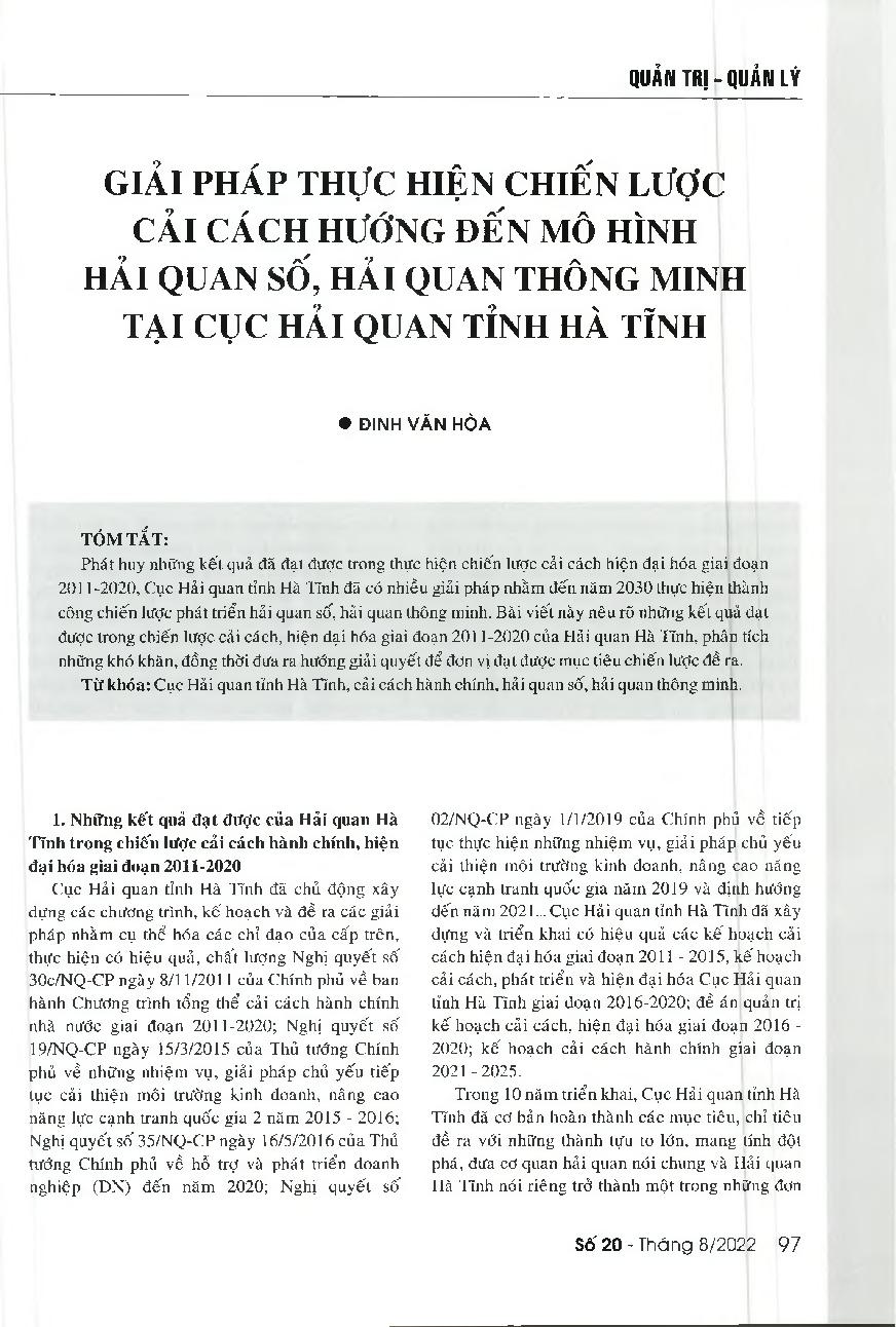 Giải pháp thực hiện chiến lược cải cách hướng đến mô hình hải quan số, hải quan thông minh tại Cục Hải quan tỉnh Hà Tĩnh = Solutions to implement the strategy of digital and smart customs development at Ha Tinh Province Department of Customs