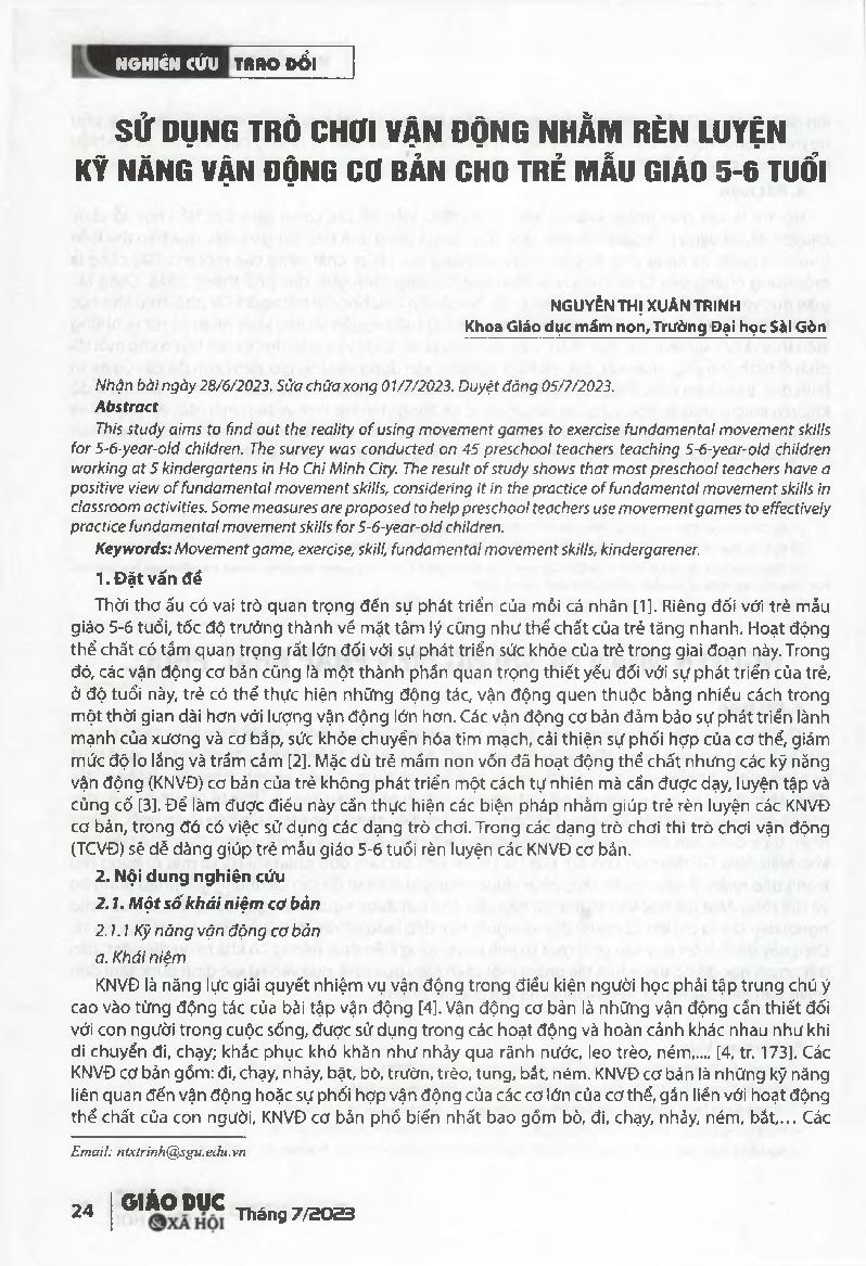 Sử dụng trò chơi vận động nhầm rèn luyện kỹ năng vận động cơ bản cho trẻ mẫu giáo 5-6 tuổi = Using movement games to exercise fundamental movement skills of 5-6-year-old children