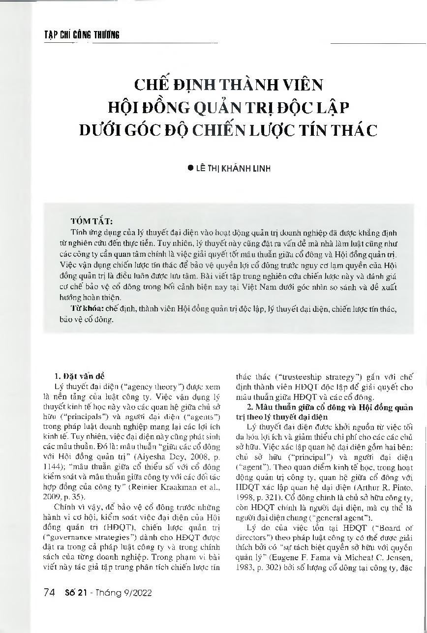 Chế định thành viên hội đồng quản trị độc lập dưới góc độ chiến lược tín thác = Regulations on independent directors of the Board of Directors from the perspective of trusteeship strategy