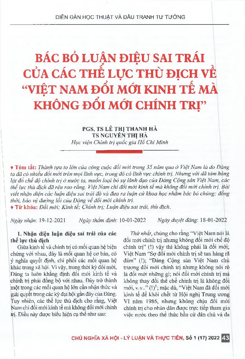 Bác bỏ luận điệu sai trái của các thế lực thù địch về "Việt Nam đổi mới kinh tế mà không đổi mới chính trị" = Refuting wrongful allegations of hostile forces on “Vietnam renovates the economy without renovating the politics”
