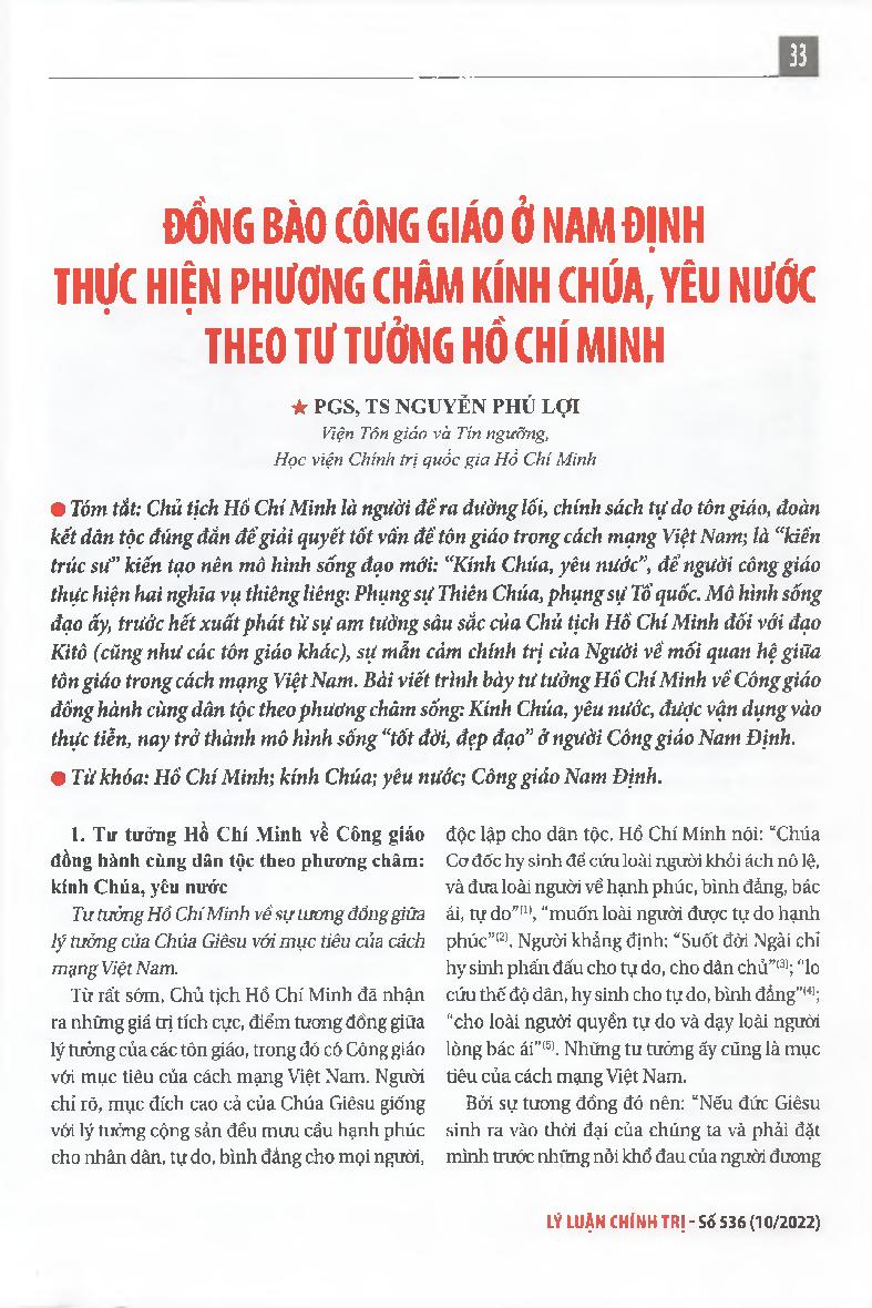 Đồng bào Công giáo ở Nam Định thực hiện phương châm kính Chúa, yêu nước theo tư tưởng Hồ Chí Minh = Catholic compatriots in Nam Dinh practice the motto of respecting God and patriotic according to Ho Chi Minh&; 39;s thought