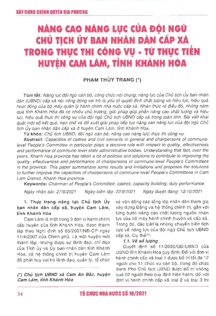 Nâng cao năng lực của đội ngũ Chủ tịch Ủy ban nhân dân cấp xã trong thực thi công vụ - Từ thực tiễn huyện Cam Lâm, tỉnh Khánh Hòa