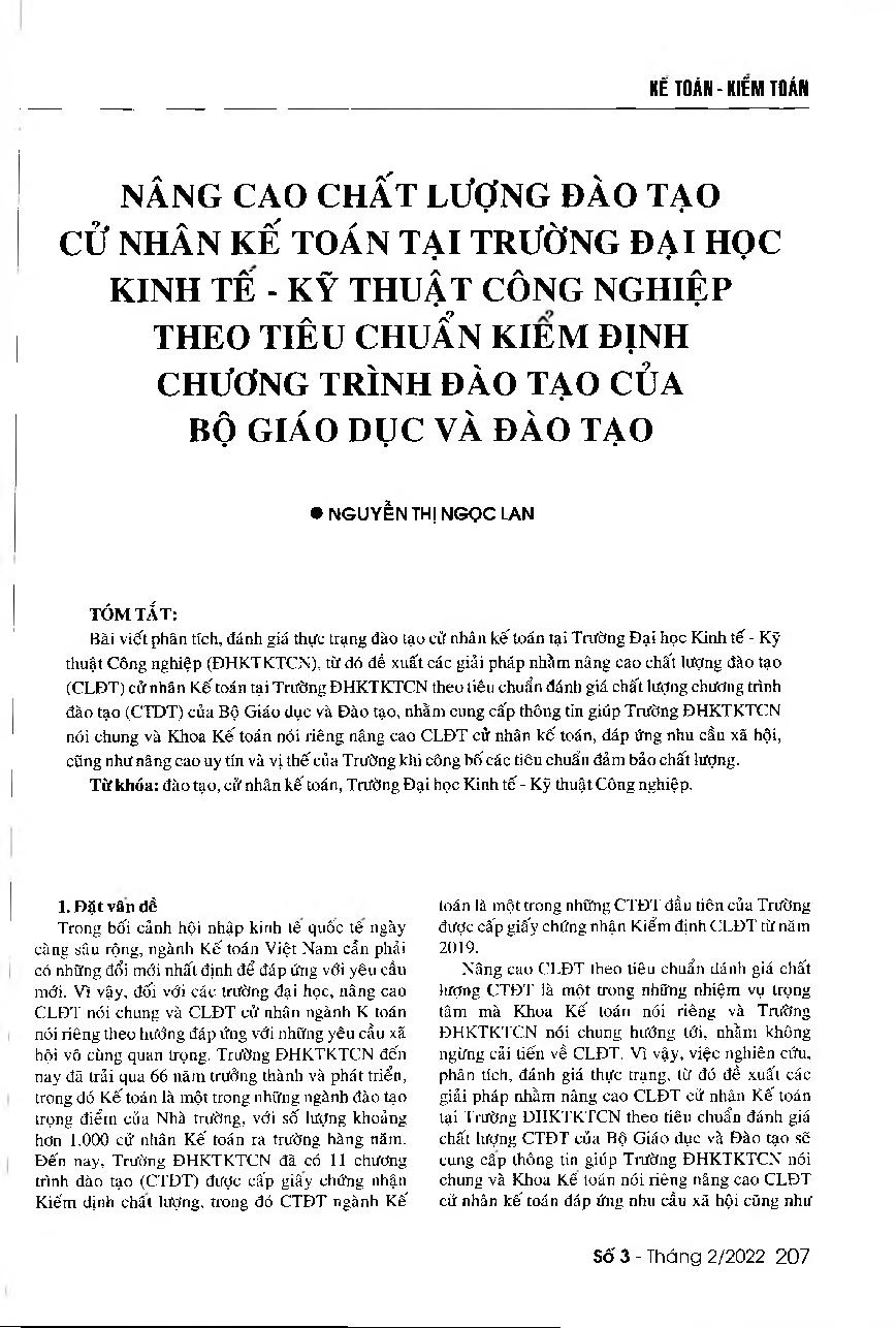 Nâng cao chất lượng đào tạo cử nhân Kế toán tại Trường Đại học Kinh tế - Kỹ thuật công nghiệp theo tiêu chuẩn kiểm định chương trình đào tạo của Bộ Giáo dục và Đào tạo = Improving the quality of training accounting students at the University of Economics
