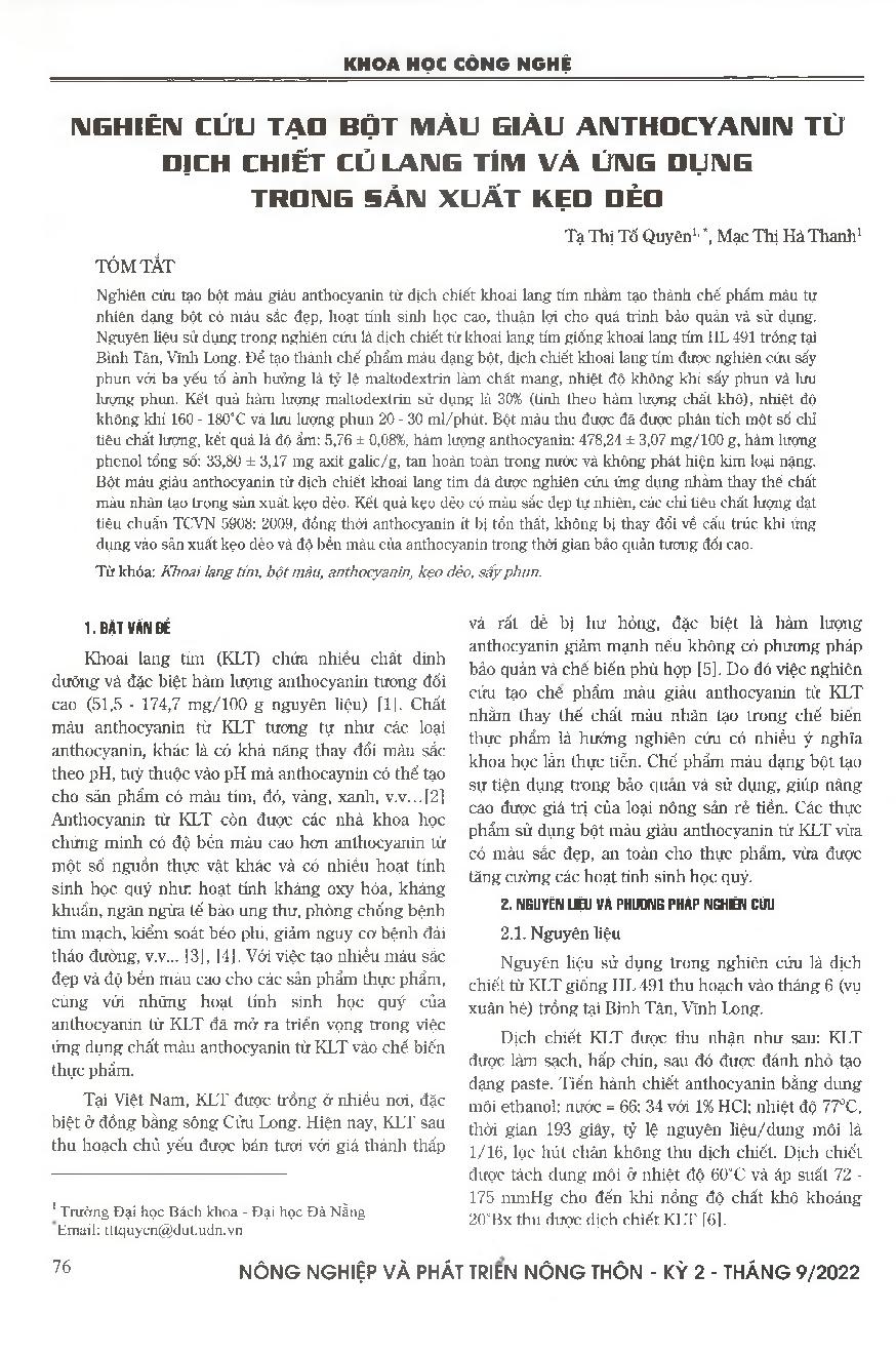 Nghiên cứu tạo bột màu giàu anthocyanin từ dịch chiết củ khoai lang tím và ứng dụng trong sản xuất kẹo dẻo = Research on production of anthocyanin-rich powder from purple sweet potatoes extracts and its application in marshmallows manufactoring