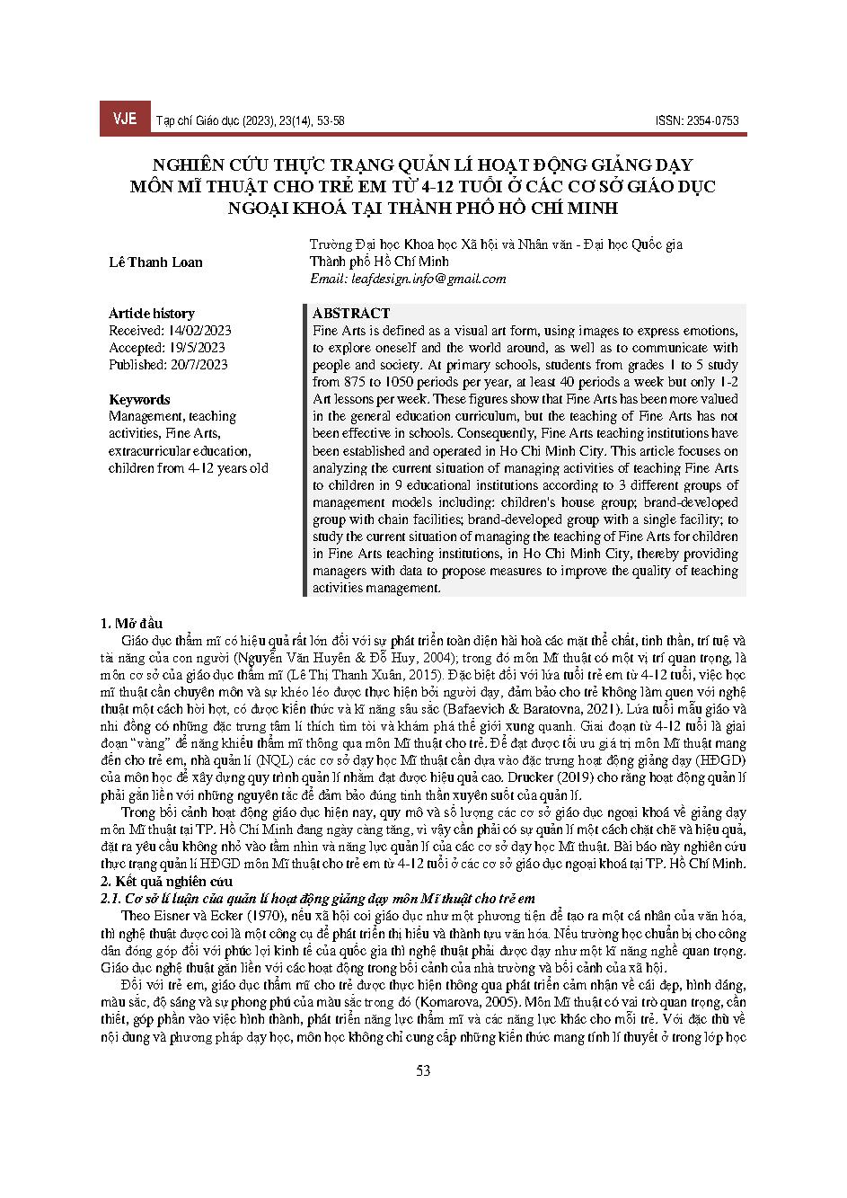 Nghiên cứu thực trạng quản lí hoạt động giảng dạy môn Mĩ thuật cho trẻ em từ 4-12 tuổi ở các cơ sở giáo dục ngoại khoá tại Thành phố Hồ Chí Minh = Research on the current situation of managing activities of teaching Fine Arts to children aged 4-12 years i