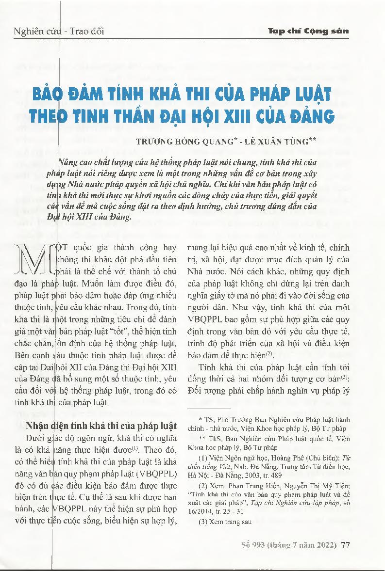 Bảo đảm tính khả thi của pháp luật theo tinh thần Đại hội XIII của Đảng = Ensuring the feasibility of the law in the spirit of the 13th Party Congress
