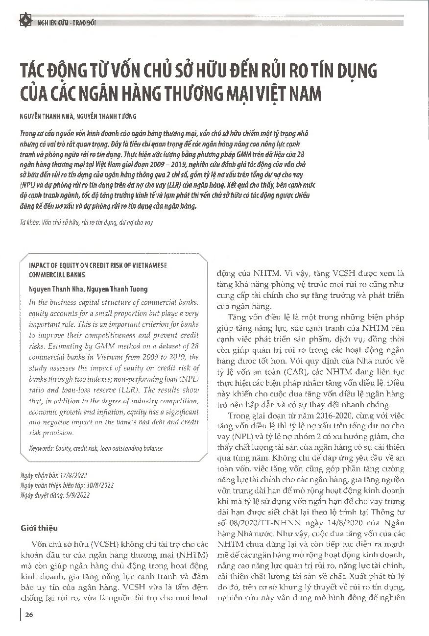 Tác động từ vốn chủ sở hữu đến rủi ro tín dụng của các ngân hàng thương mại Việt Nam = Impact of equity on credit risk of Vietnamese commercial banks