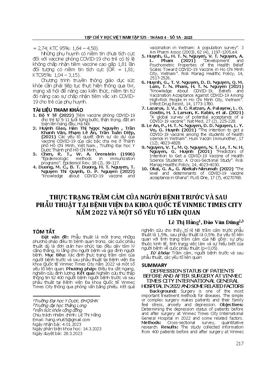 Thực trạng trầm cảm của người bệnh trước và sau phẫu thuật tại Bệnh viện Đa khoa Quốc tế Vinmec Times city năm 2022 và một số yếu tố liên quan = Depression status of patients before and after surgery at Vinmec times city international general hospita