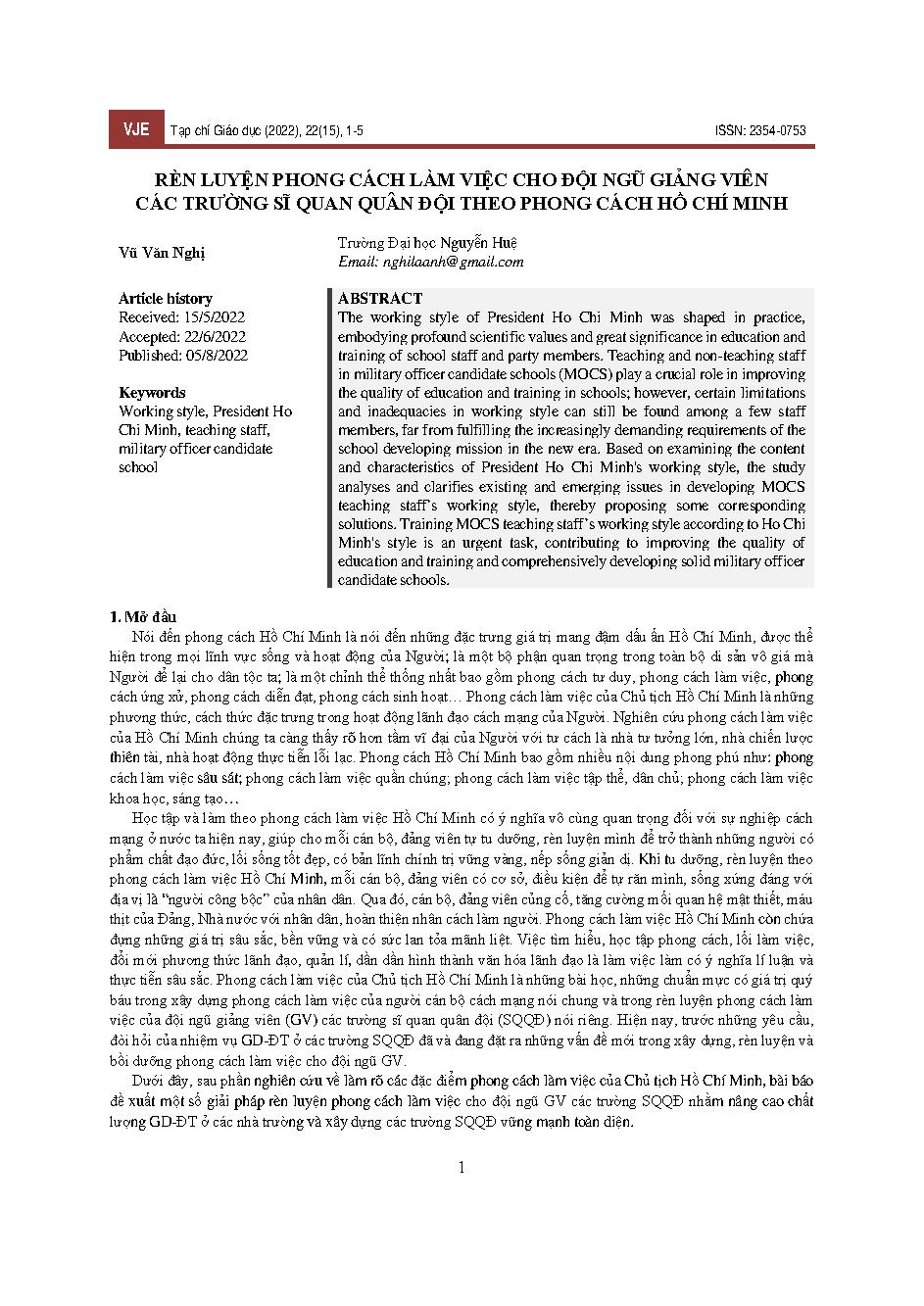 Rèn luyện phong cách làm việc cho đội ngũ giảng viên các trường sĩ quan quân đội theo phong cách Hồ Chí Minh = Training the working style for the teaching staff of military officer schools according to Ho Chi Minh&; 39;s style