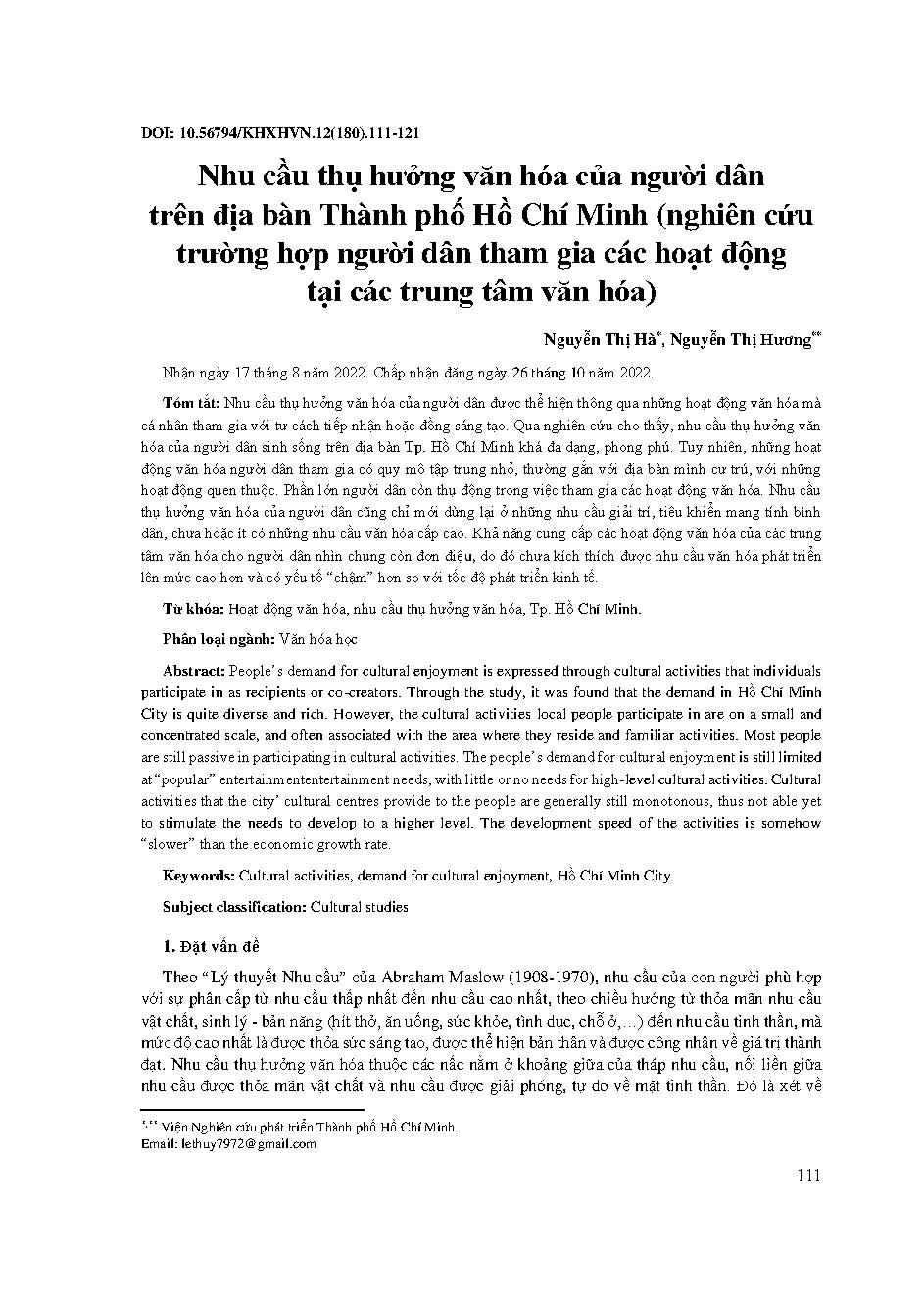 Nhu cầu thụ hưởng văn hóa của người dân trên địa bàn Thành phố Hồ Chí Minh (nghiên cứu trường hợp người dân tham gia các hoạt động tại các trung tâm văn hóa) = Need for cultural enjoyment of people in Ho Chi Minh City (case study of people participating i