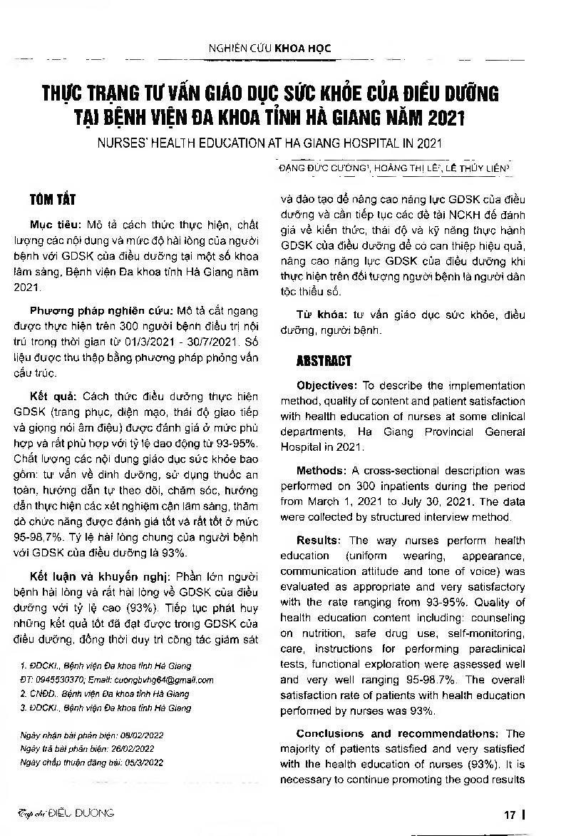 Thực trạng tư vấn giáo dục sức khỏe của điều dưỡng tại Bệnh viện đa khoa tỉnh Hà Giang năm 2021 = Nurses' health education at Ha Giang hospital in 2021