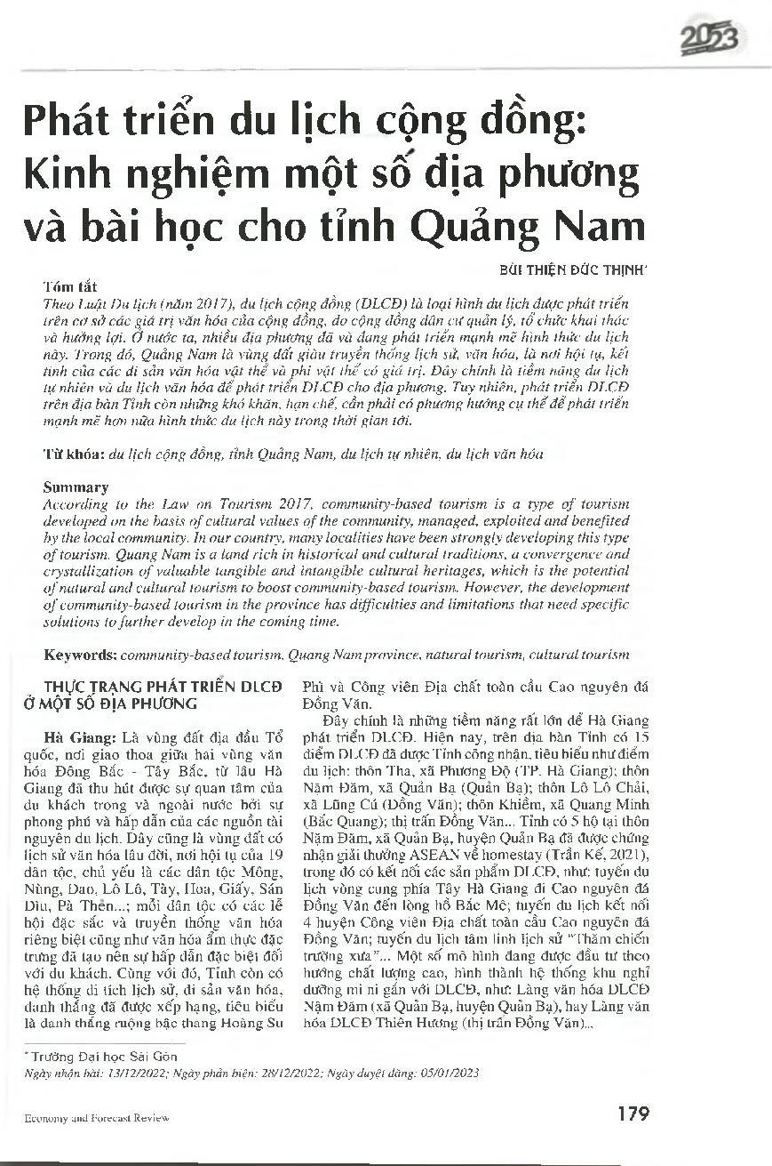 Phát triển du lịch cộng đồng: Kinh nghiệm một số địa phương và bài học cho tỉnh Quảng Nam = Developing community-based tourism: Experiences of some localities and lessons for Quang Nam province