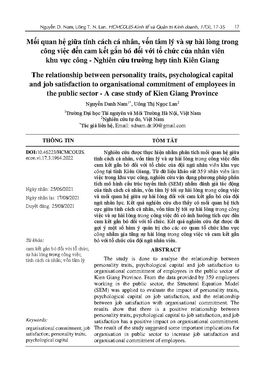 Mối quan hệ giữa tính cách cá nhân, vốn tâm lý và sự hài lòng trong công việc đến cam kết gắn bó đối với tổ chức của nhân viên khu vực công - Nghiên cứu trường hợp tỉnh Kiên Giang = The relationship between personality traits, psychological capital and jo