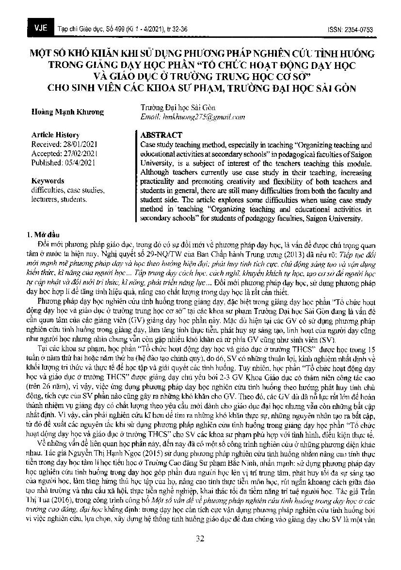 Một số khó khăn khi sử dụng phương pháp nghiên cứu tình huống trong giảng dạy học phần “Tổ chức hoạt động dạy học và giáo dục ở trường trung học cơ sở” cho sinh viên các Khoa Sư phạm, Trường Đại học Sài Gòn
