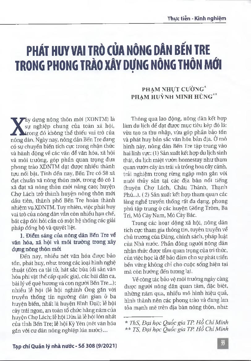 Phát huy vai trò của nông dân Bến Tre trong phong trào xây dựng nông thôn mới